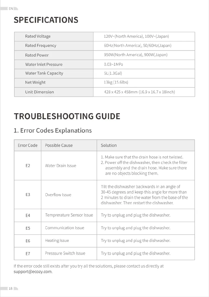 Ecozy DW01 - Specifications; Technical Specifications; Troubleshooting Guide; Error Codes Explanations