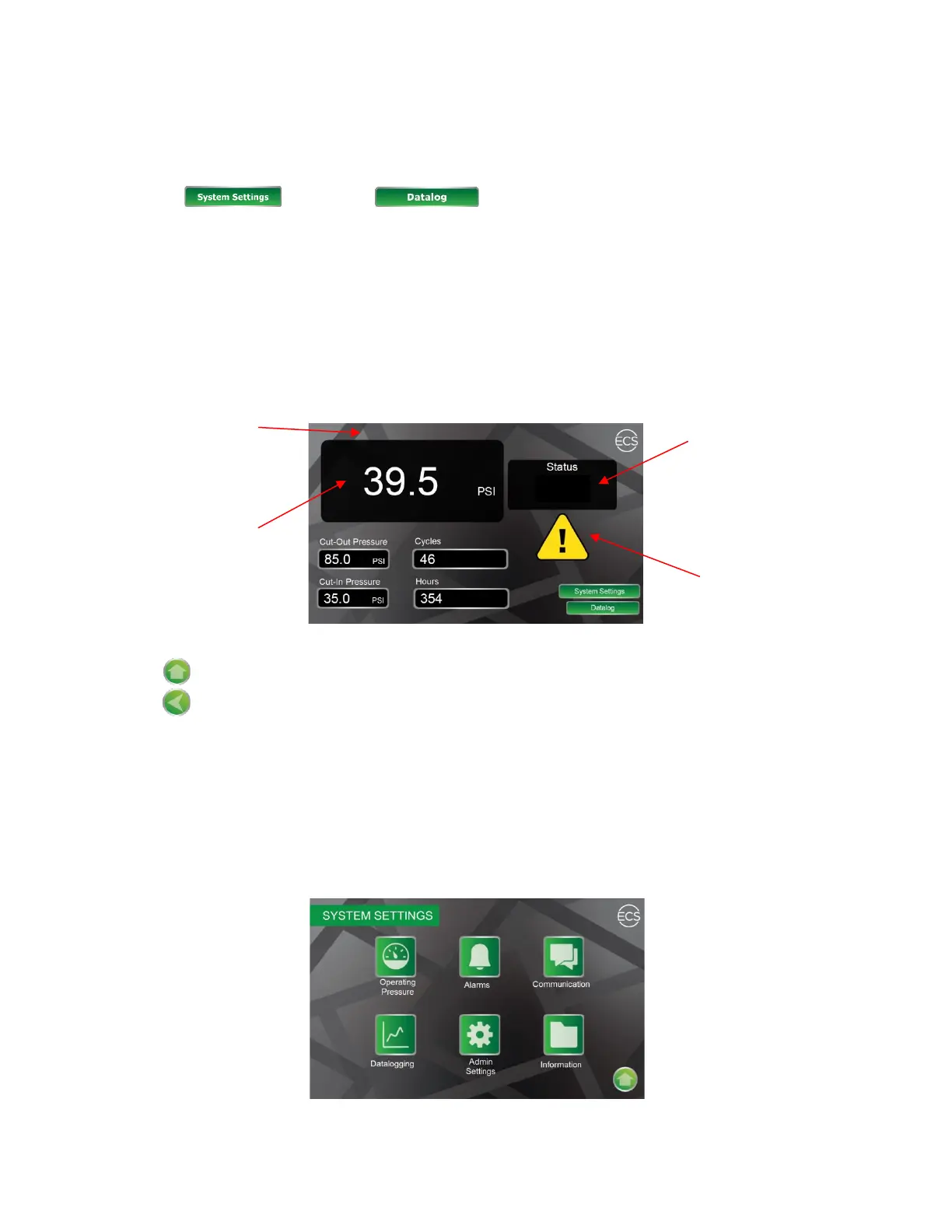 The System Settings Screen provides access to the Operating Pressure Screen, Alarms Screen,