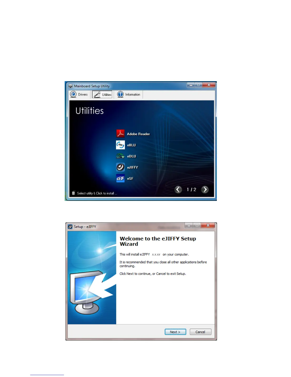1. Insert ECS software utility DVD and enter below “Utilities” screen. Click eJIFFY