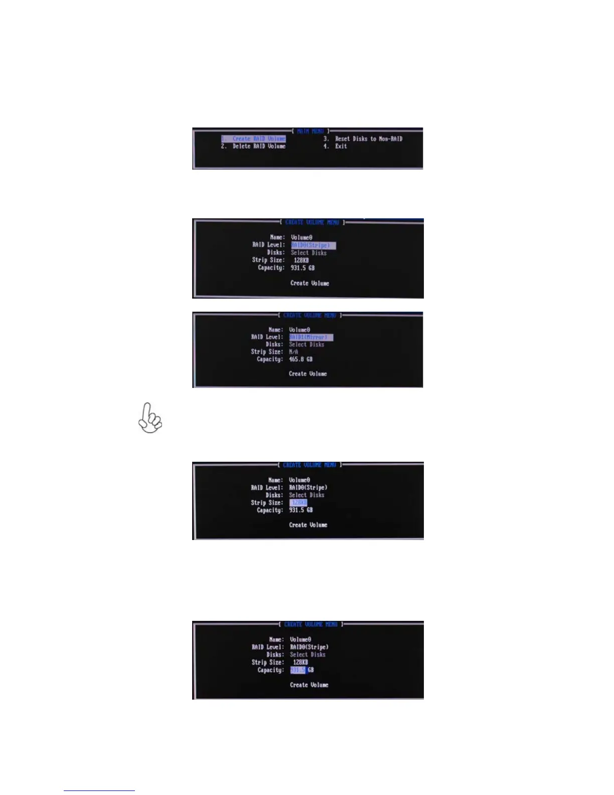 3. Key in the RAID volume capacity. Use the up/down arrow to choose the