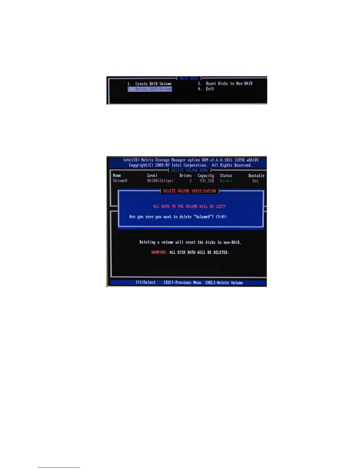 Delete RAID Volume using the up/down arrow key then press <Enter>.