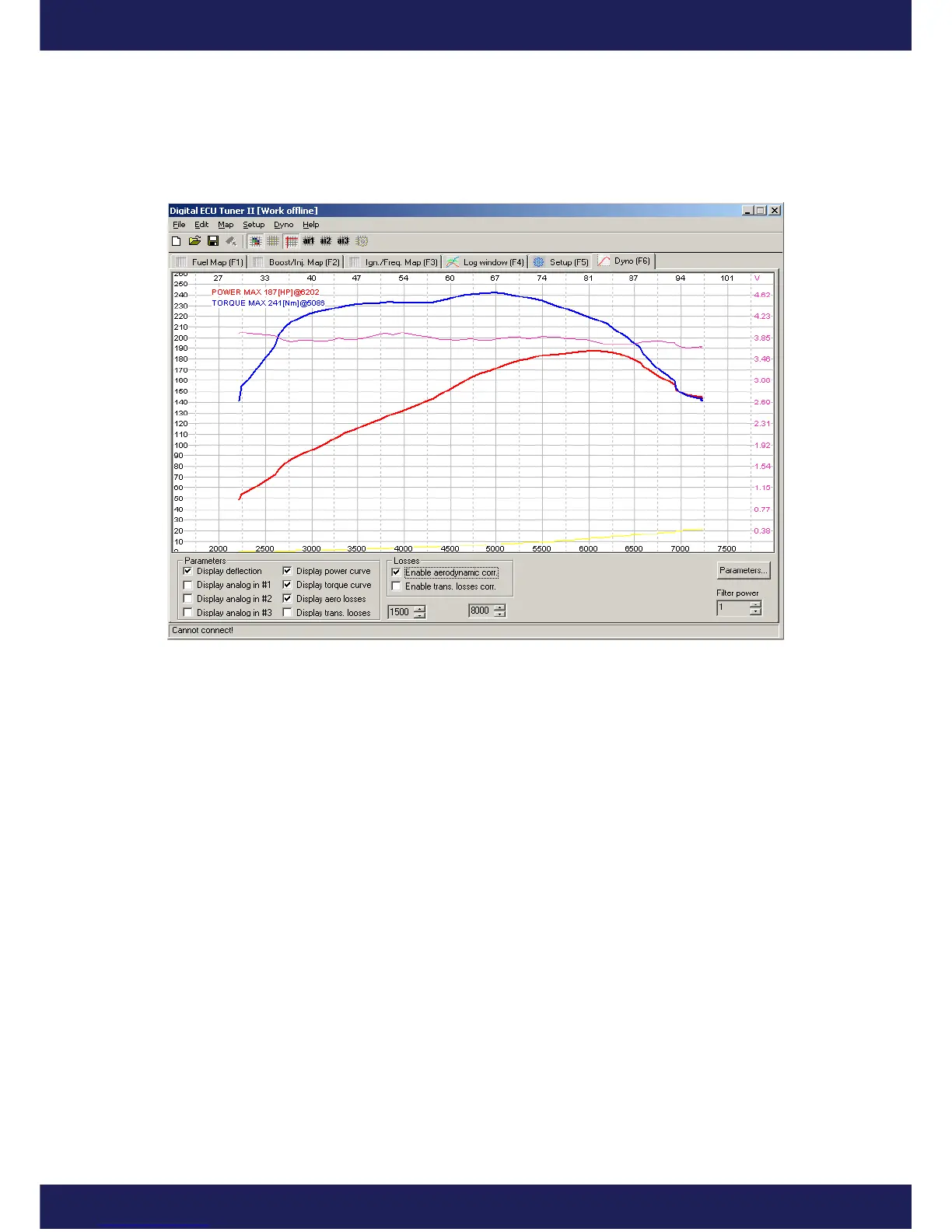 The generated graph can be exported to a folder in a BMP format. To do this, choose Export Dyno Graph as BMP