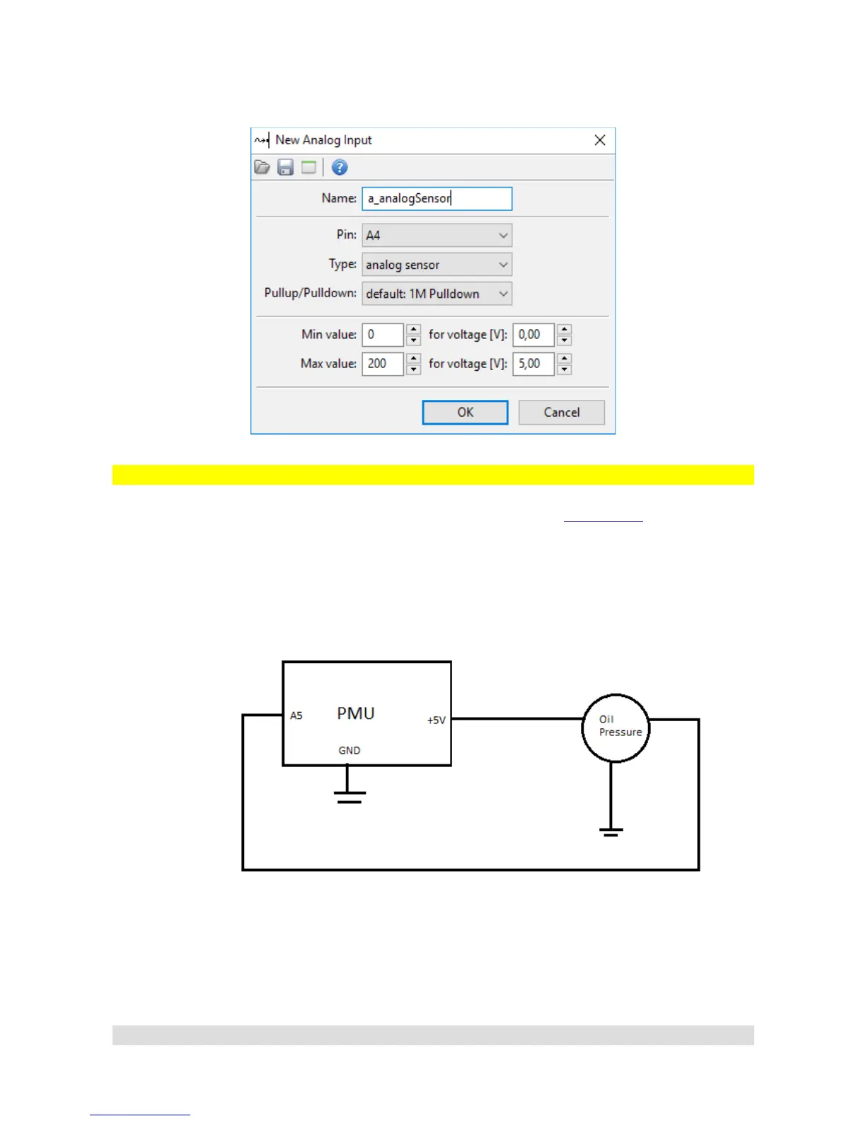 To connect analog Sensor, +5V and GND Pins must be used (See PMU Pinout section). Output