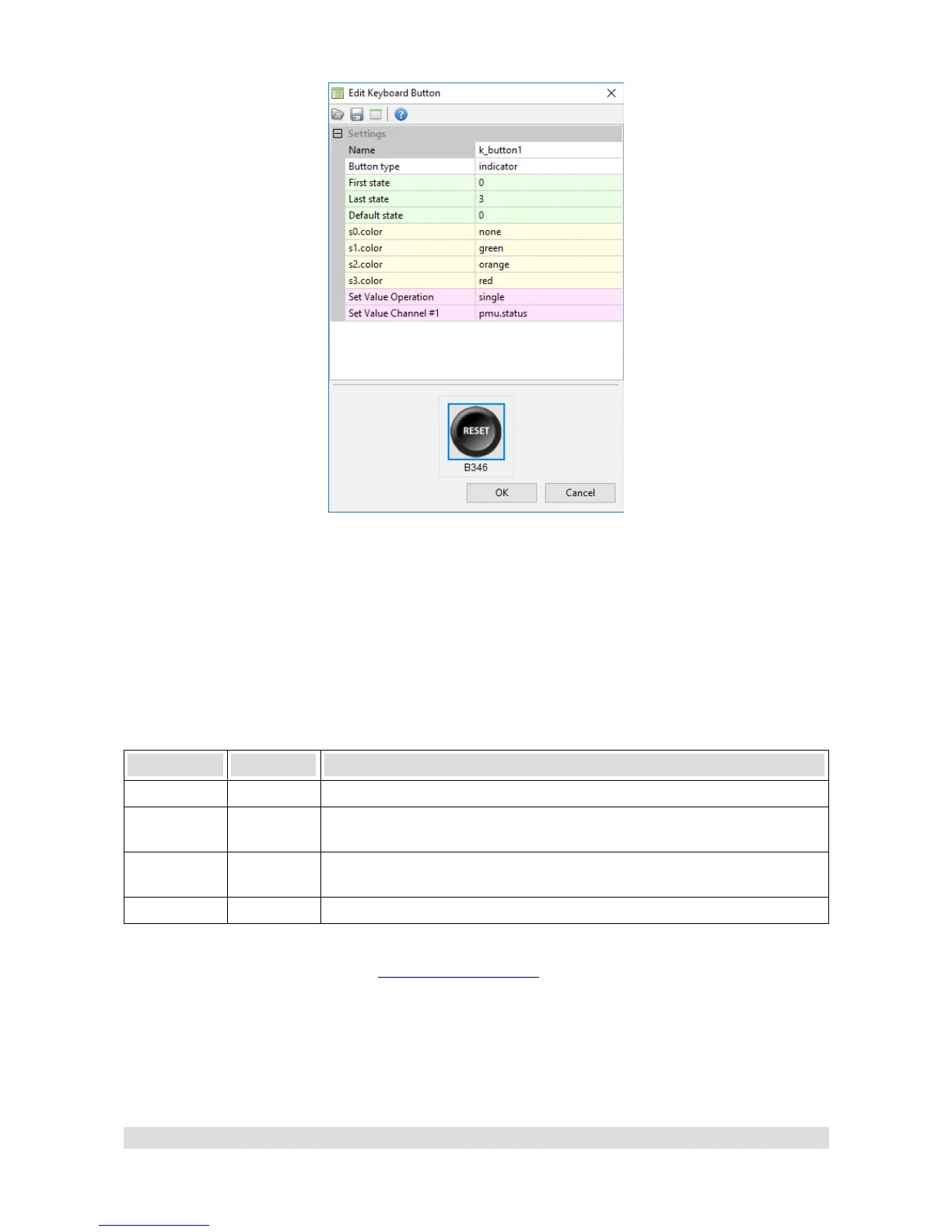 This example configures button k_button1 to display the value of pmu.status channel in the