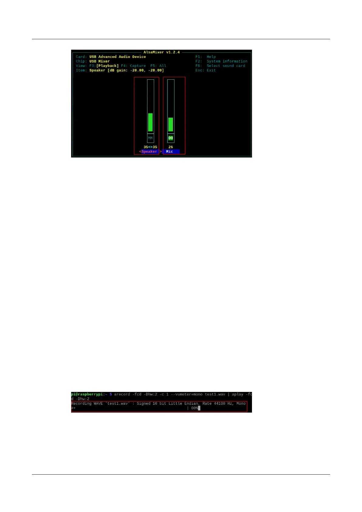 arecord -fcd -Dhw:2 -c 1 --vumeter=mono test1.wav | aplay -fcd -Dhw:2