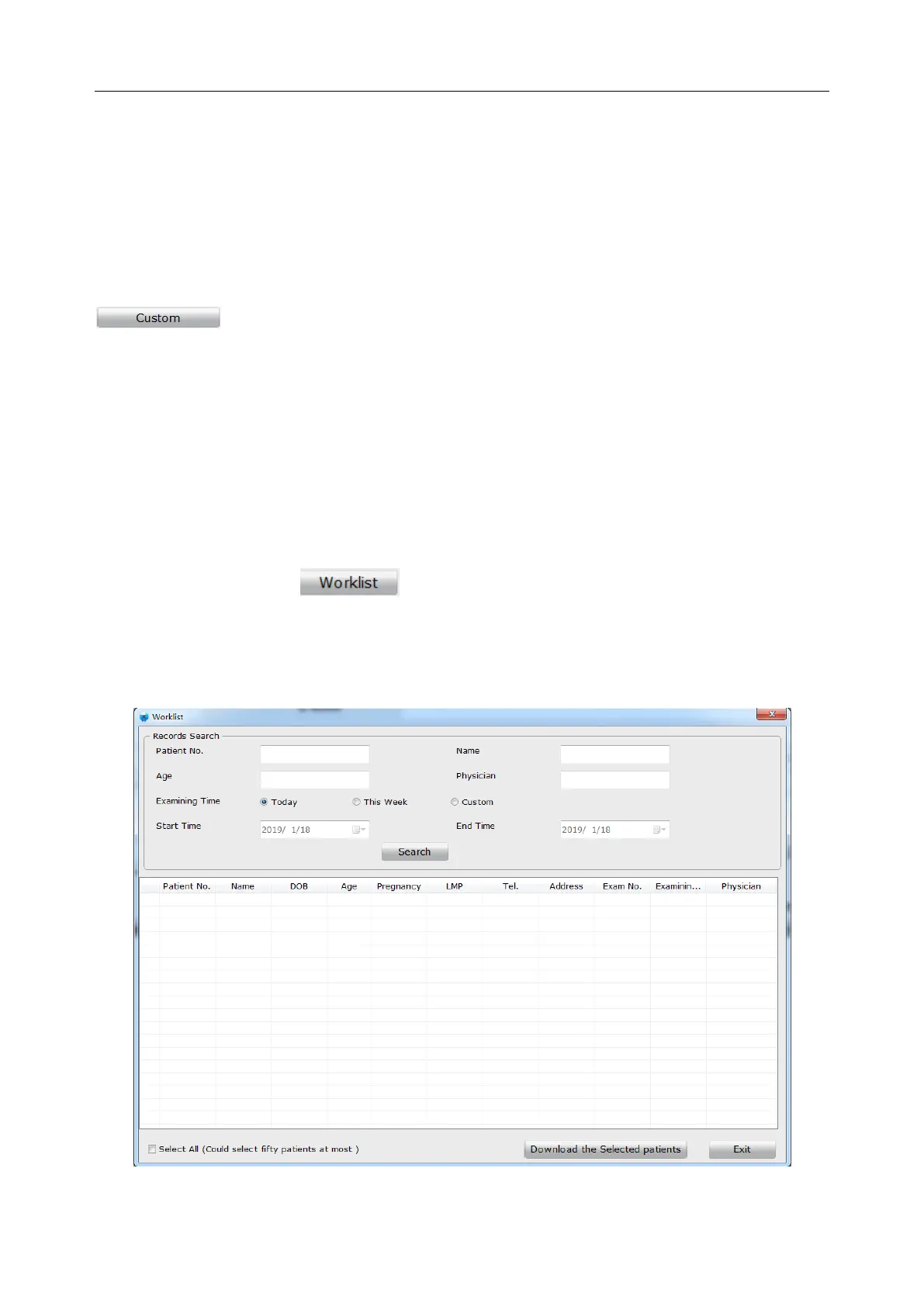 search conditions such as Patient No., Name, Age, Physician, Examining time, and then click