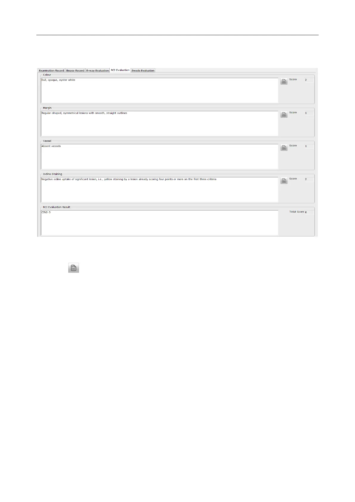 On the RCI Evaluationtab, you can perform RCI (Reid Colposcopic Index) evaluation.