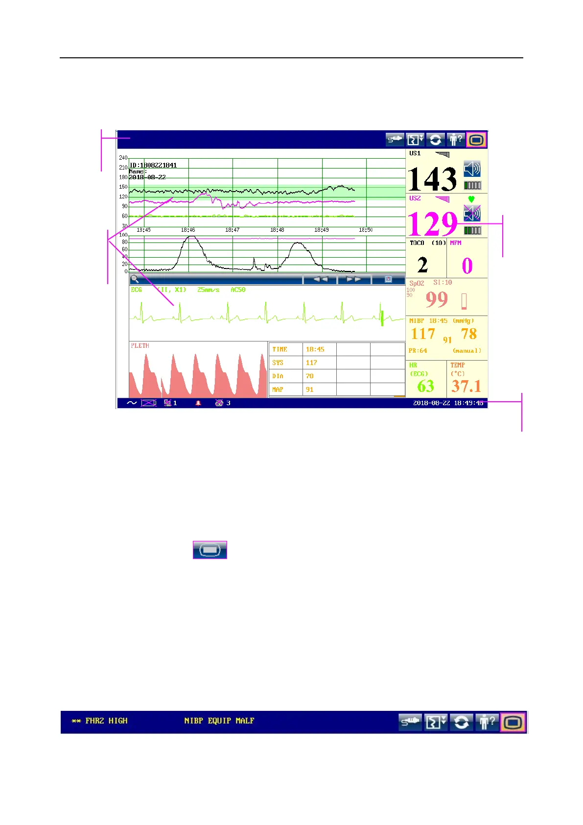 The main interface of the monitor displays traces, waves, numerics, menus and monitor status