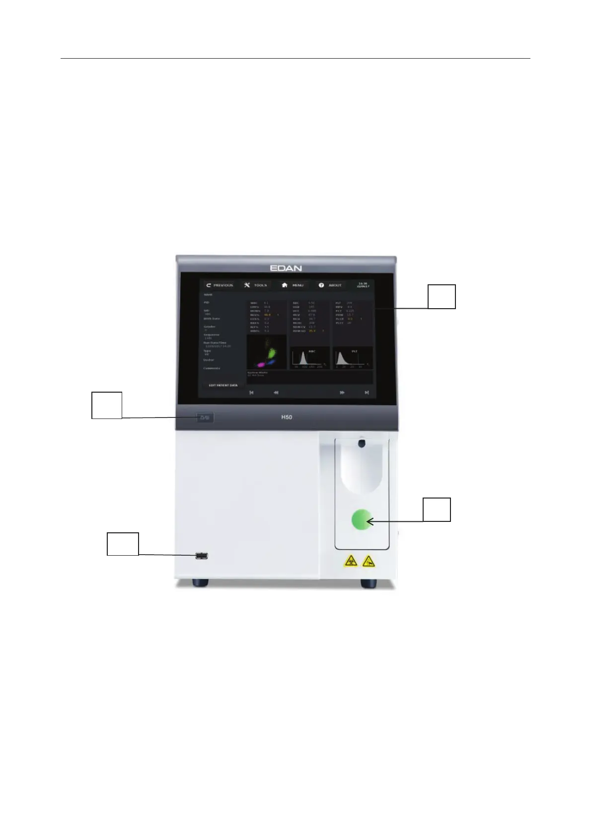 H50/H51 Analyzer consists of front cover, fluidic part, reagent area, connection board, external