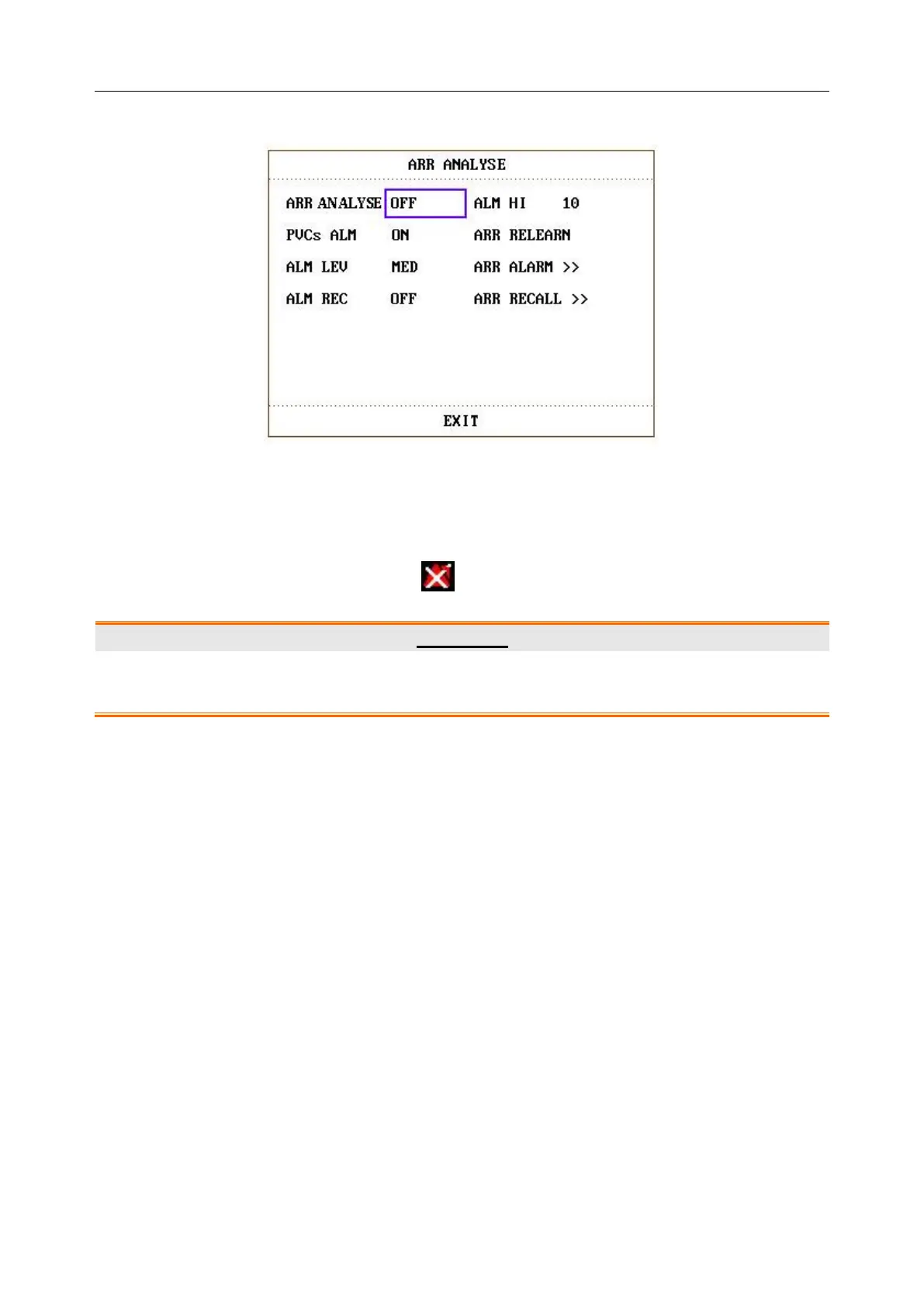 ARR ALARM Pick this item to access the ARR ALARM dialog box to set arrhythmia