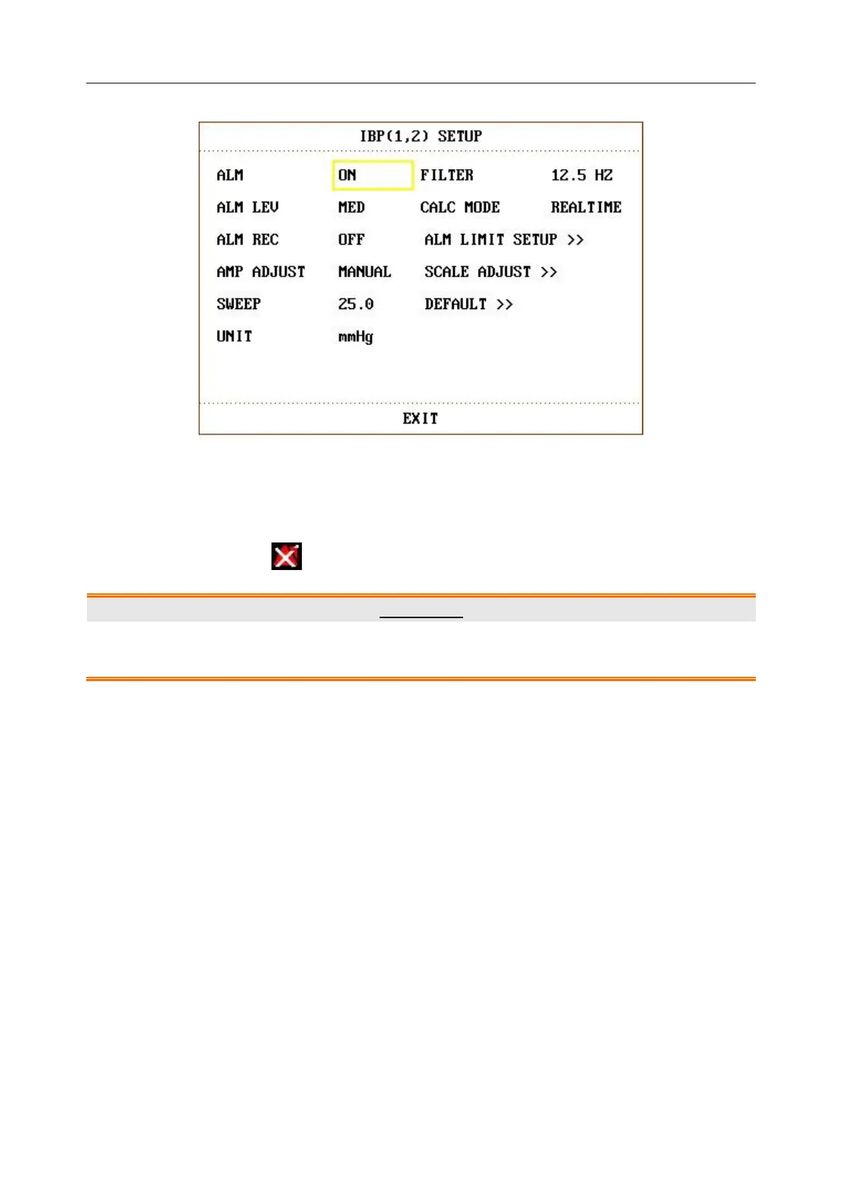 ALM REC: select ON to enable recording during the IBP alarm or to OFF to disable the