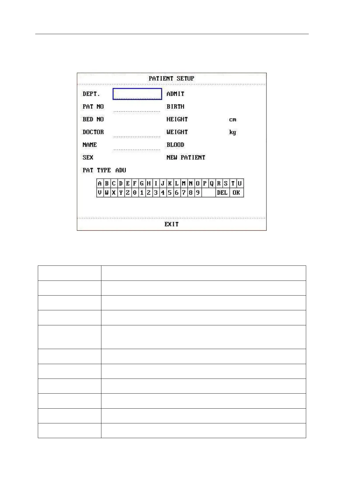 Pick PATIENT SETUP in SYSTEM MENU to call up the following menu.
