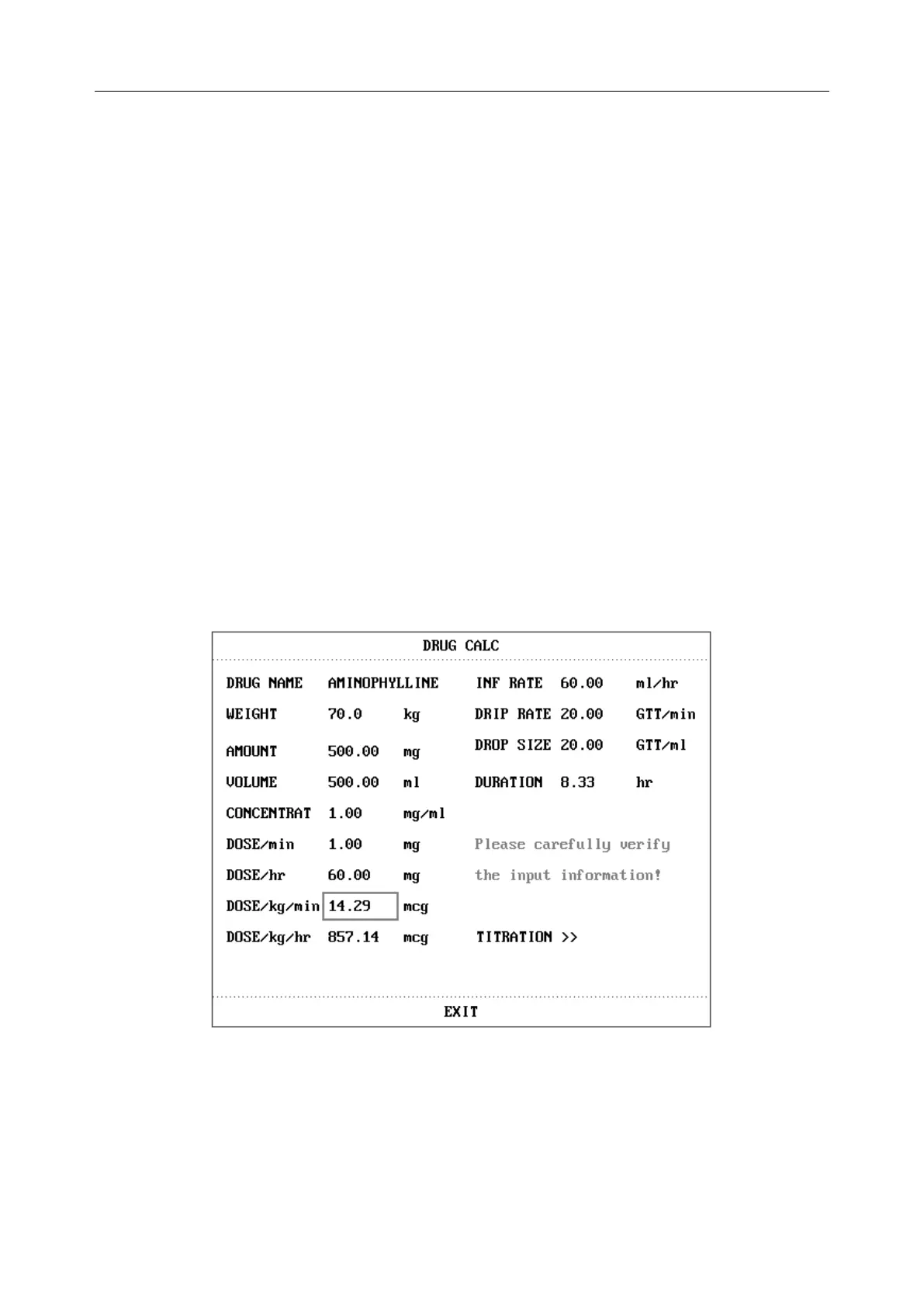 By selecting DRUG CALC in SYSTEM MENU, the following DRUG CALC window appears: