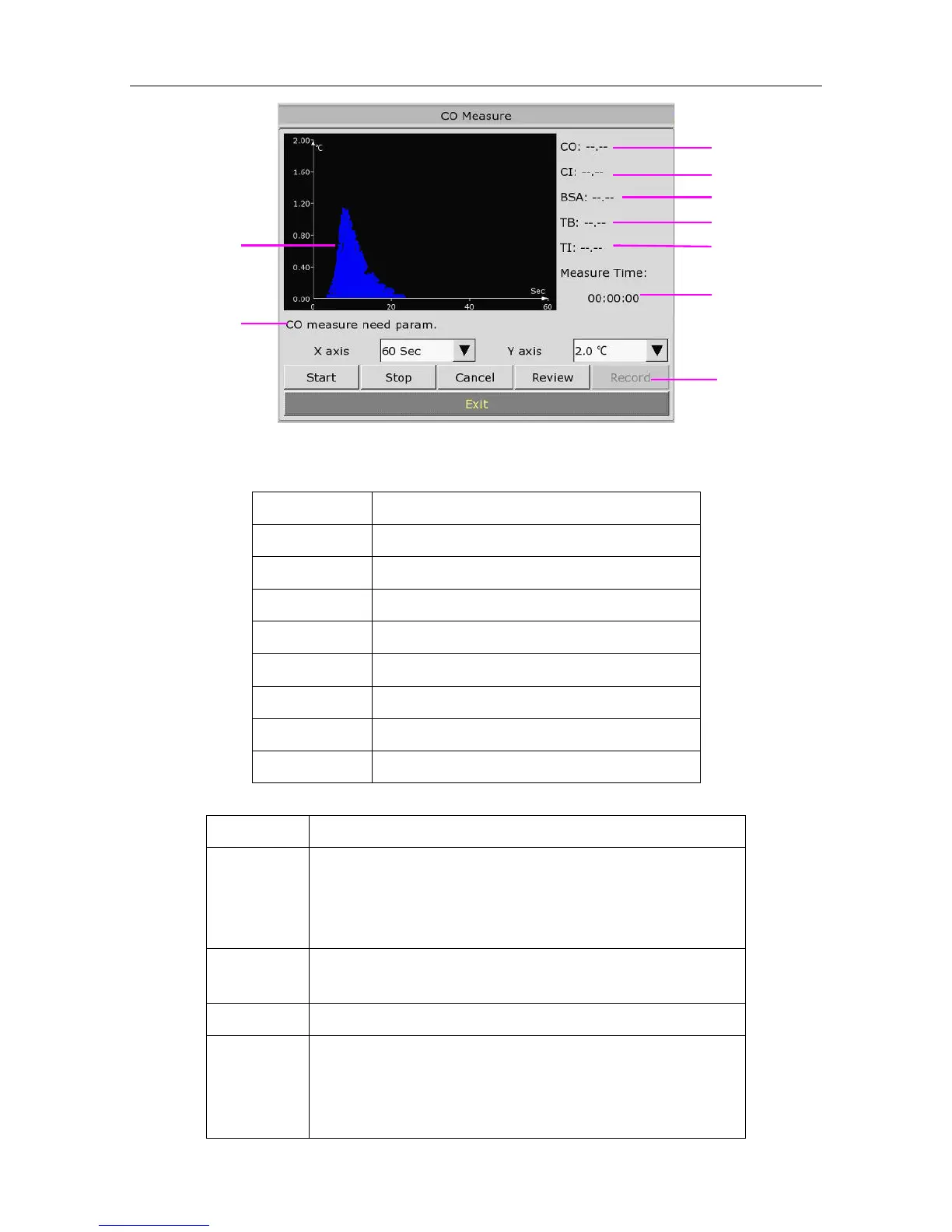 The functional keys on the C.O. measure window are explained in the following table: