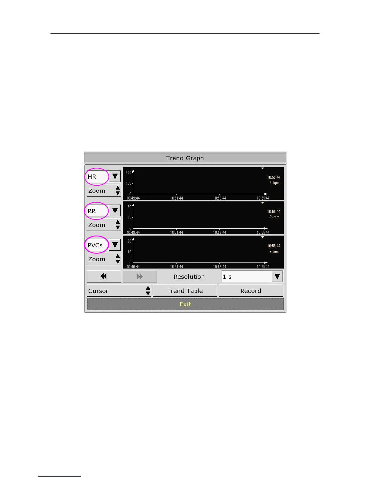 The monitor can review trend graph of different parameters. To change the existing trend graph,