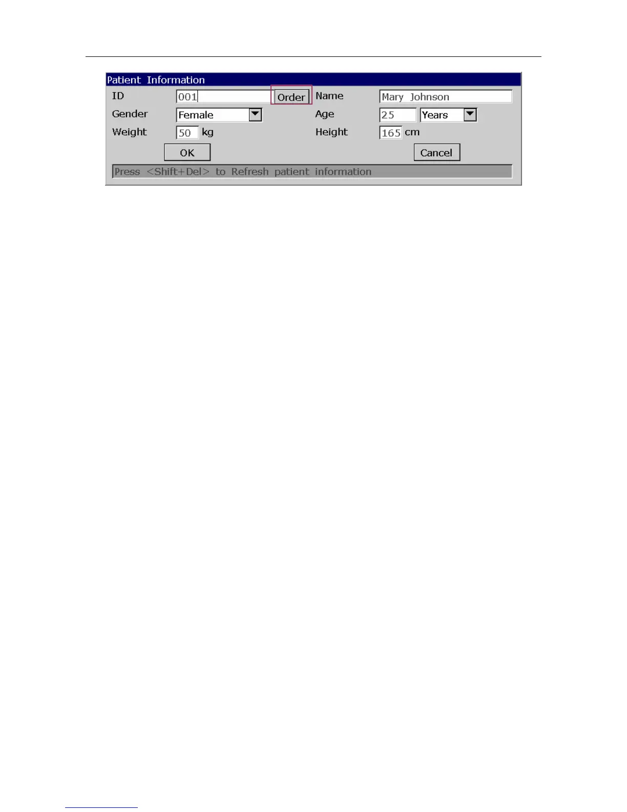 6. Enter the patient ID manually in the ID textbox and press Order, then the matched order will
