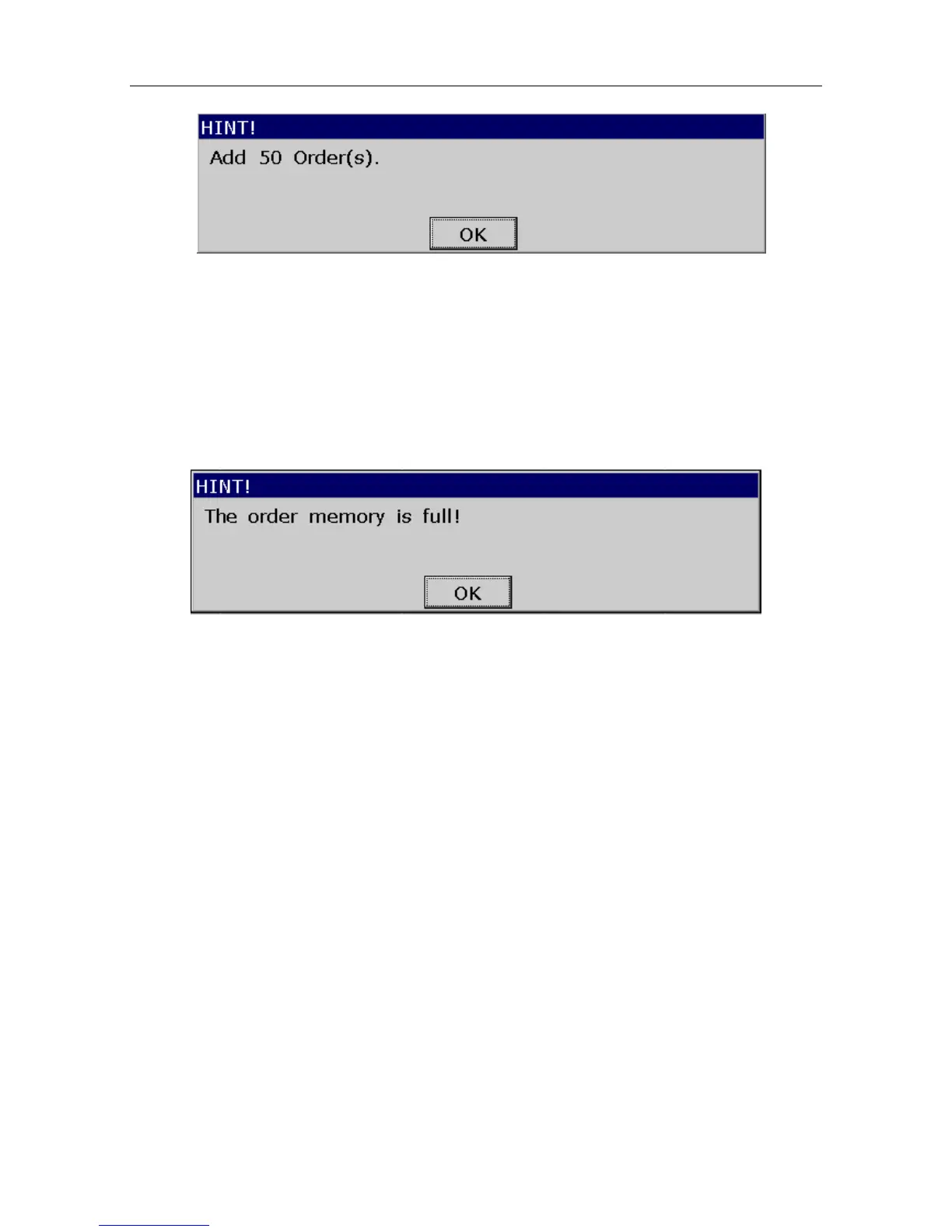 6. If 200 orders already exist on the Order Manager screen, the following hint pops up after