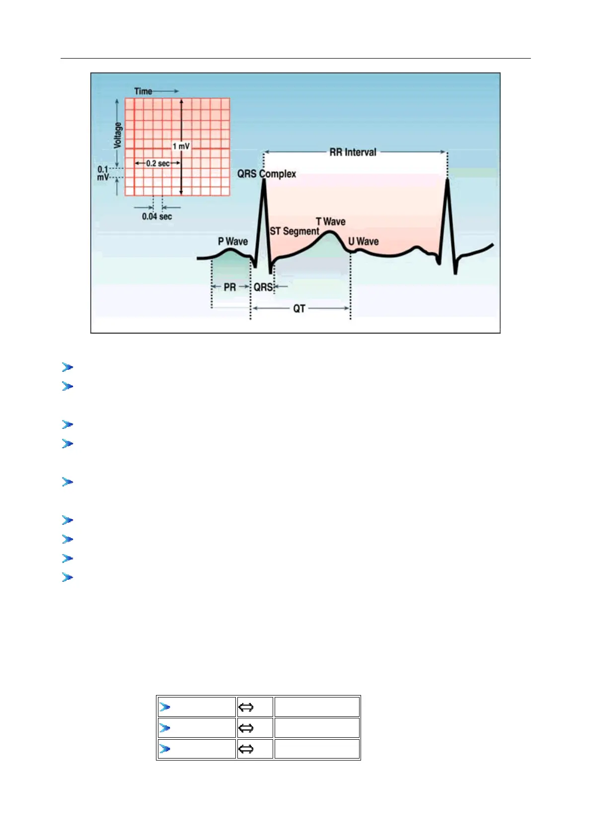 PR interval: the interval from the onset of the atrial depolarization (P wave) to the onset of the