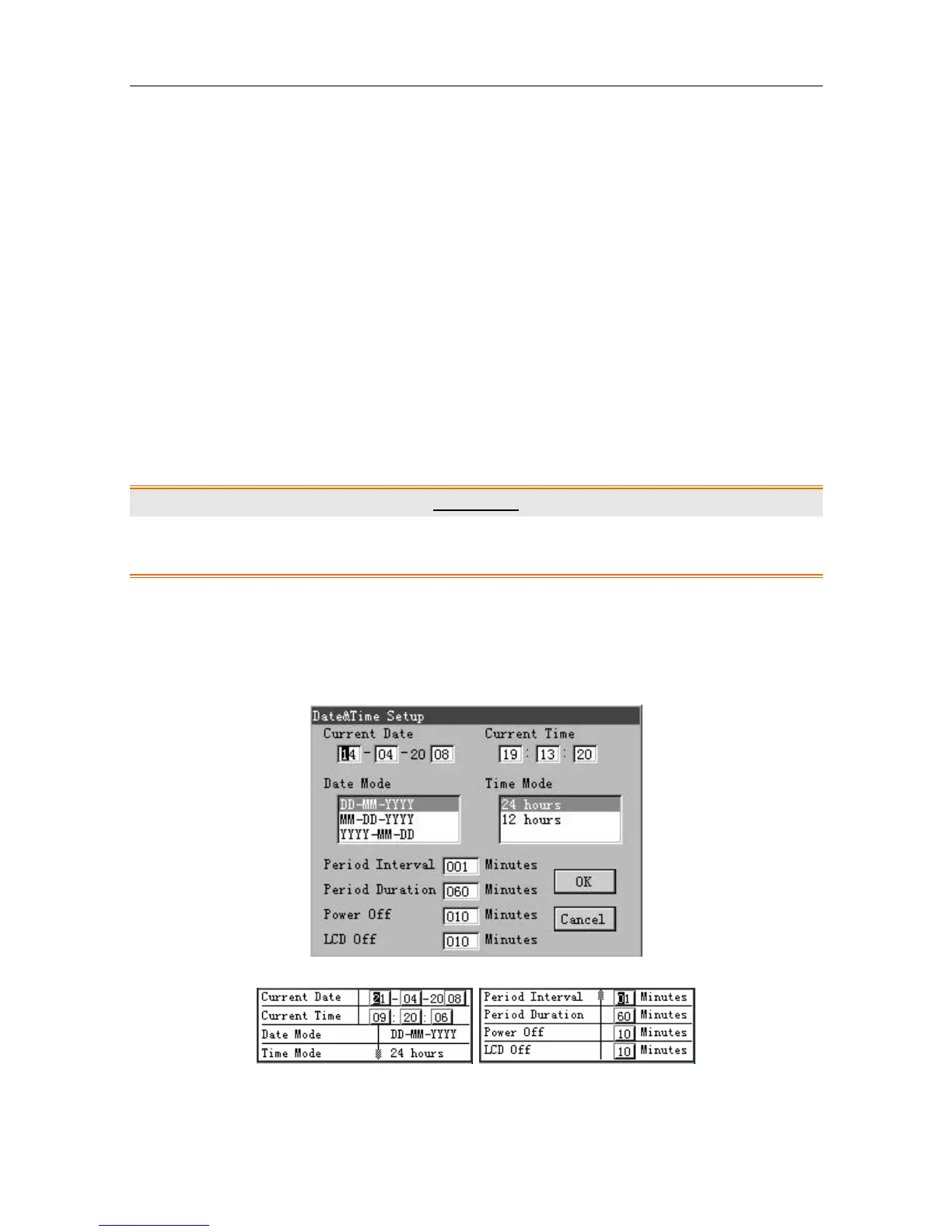 In the Date&Time Setup window, you can set Current Date, Current Time, Date Mode, Time