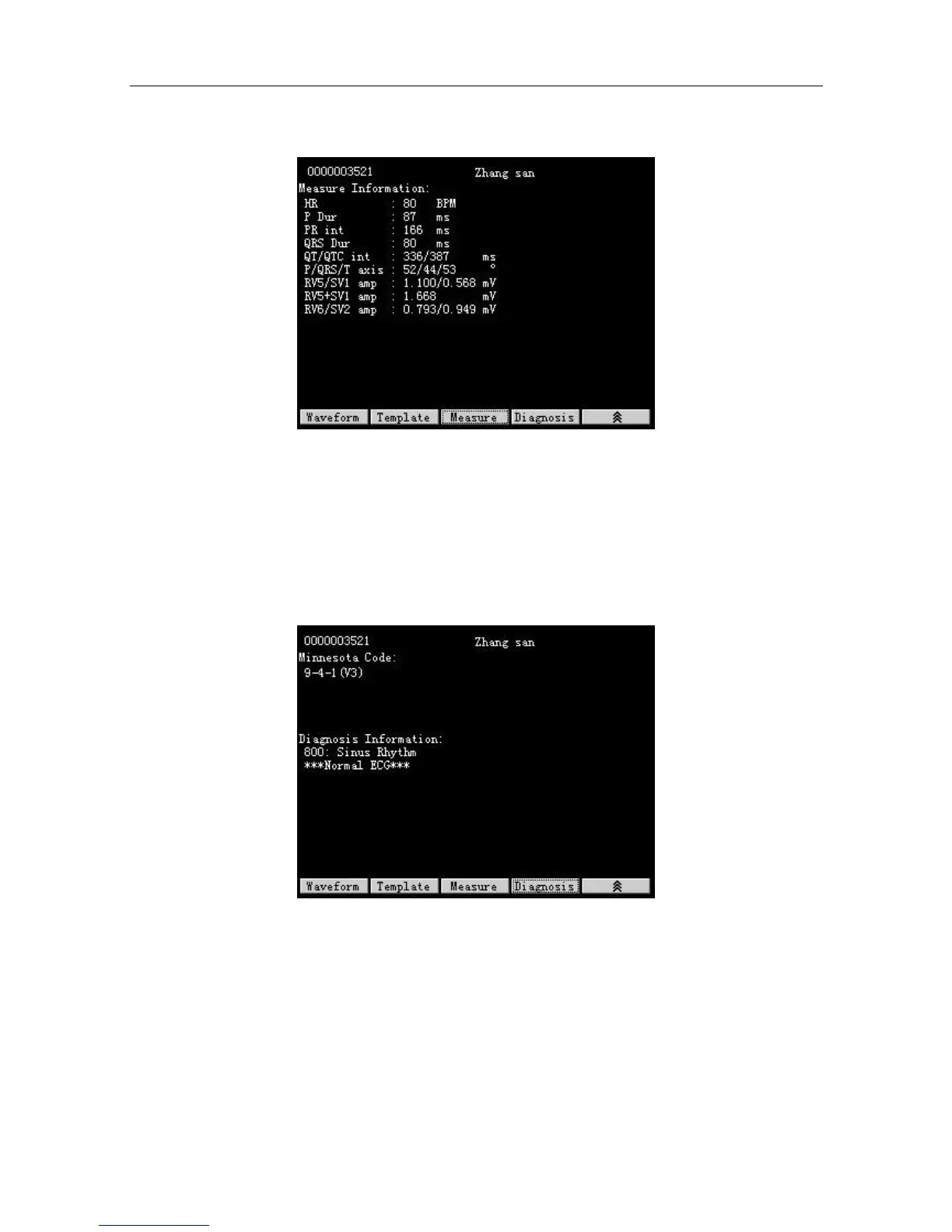 The diagnosis preview screen shows patient name, patient ID, Minnesota code and diagnosis