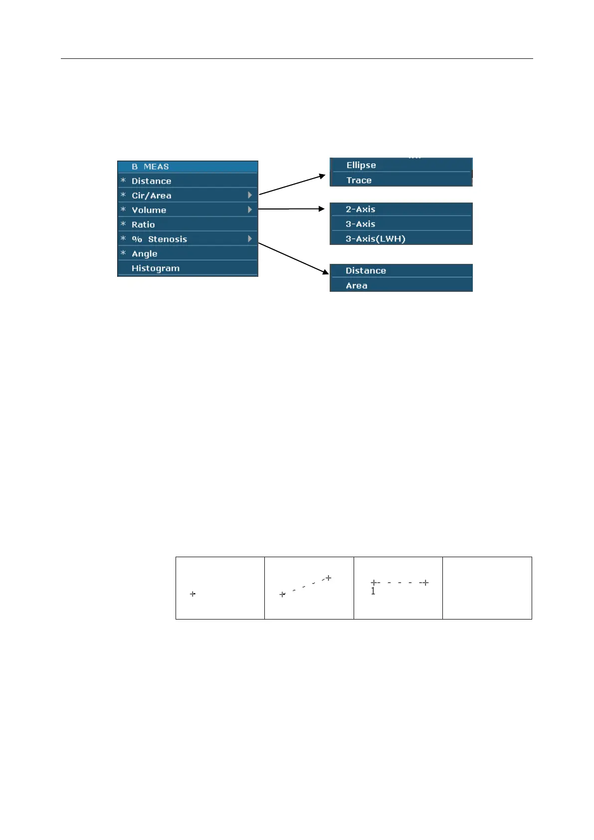 The default measurement of B mode is distance measurement. B mode measurement menus are