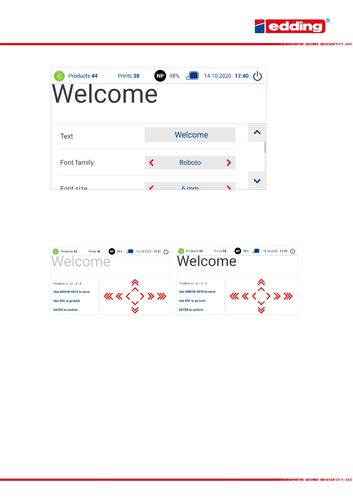 and size are displayed depending on field type. An external keyboard or the printer's on-screen