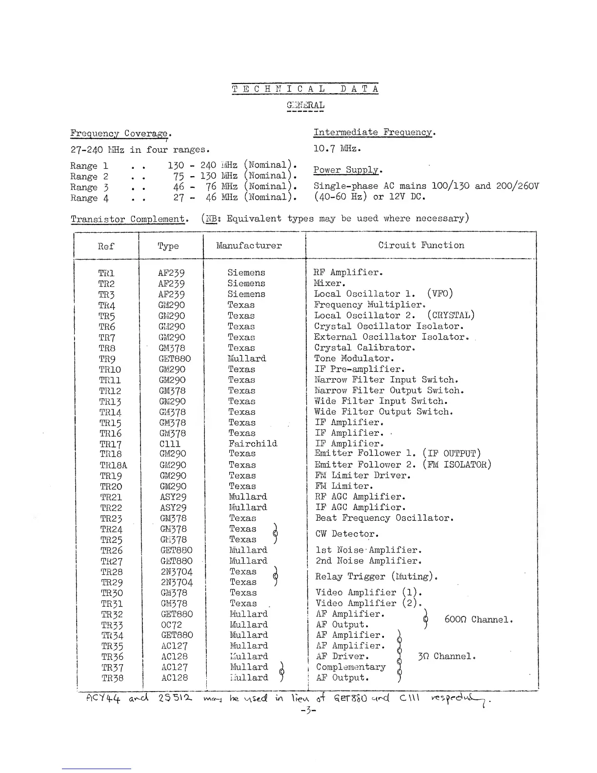 Eddystone 990R - Technical Data; General; Transistor Complement