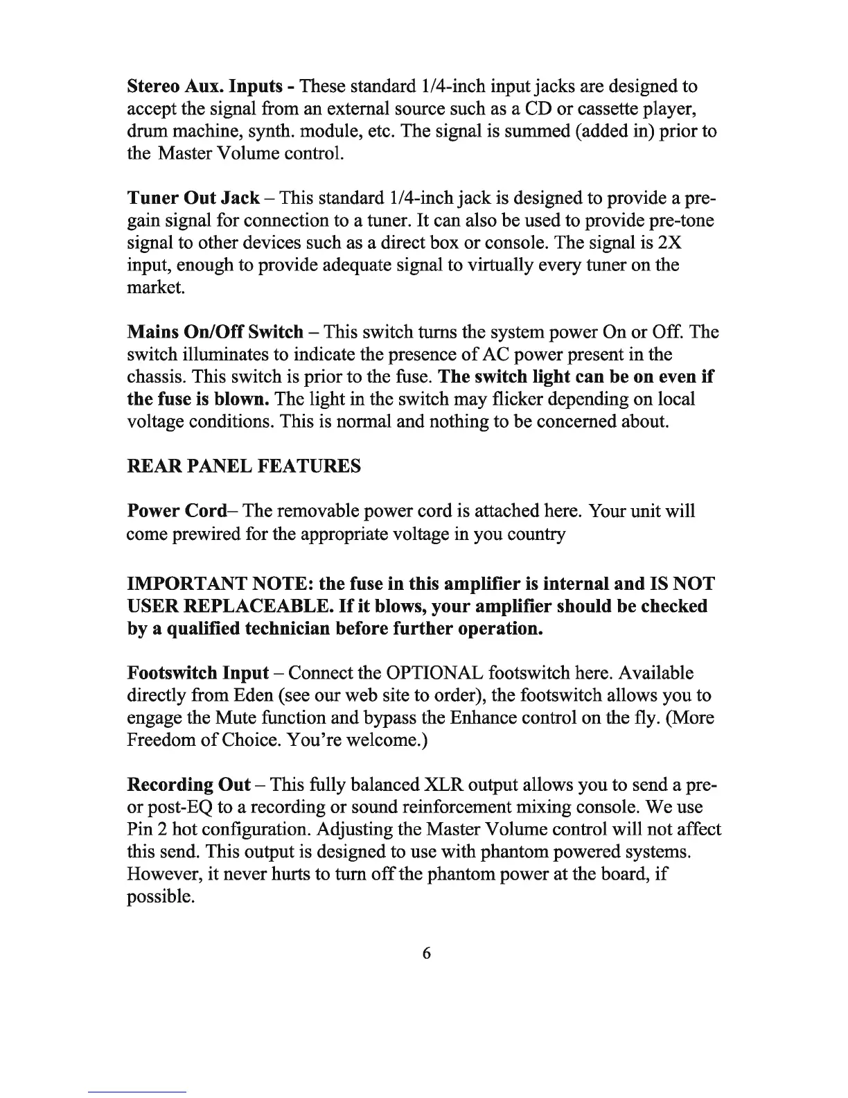 Eden WTX-264 - Stereo Aux. Inputs; Tuner Out Jack; Mains On;Off Switch; Rear Panel Features