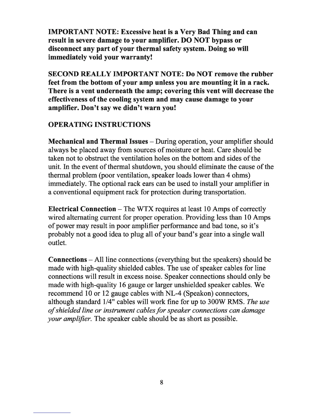 Eden WTX-264 - Operating Instructions; Mechanical and Thermal Issues; Electrical Connection; Cable Connections