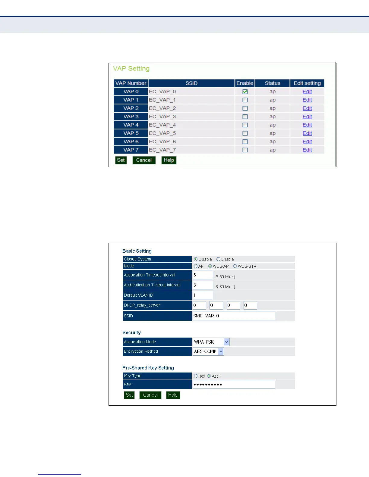 5. On the VAP Setting page, enable VAP 0, and then click Set to