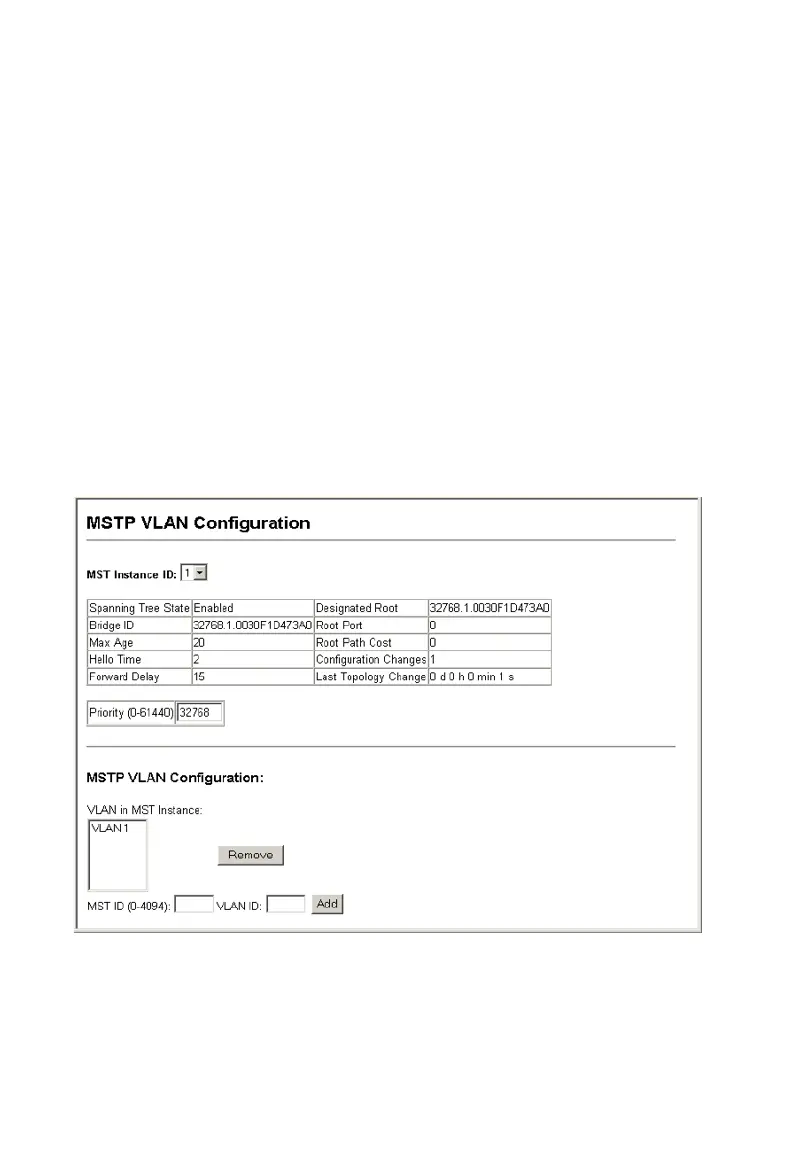 • MST ID – Instance identifier to configure. (Range: 0-4094; Default: 0)