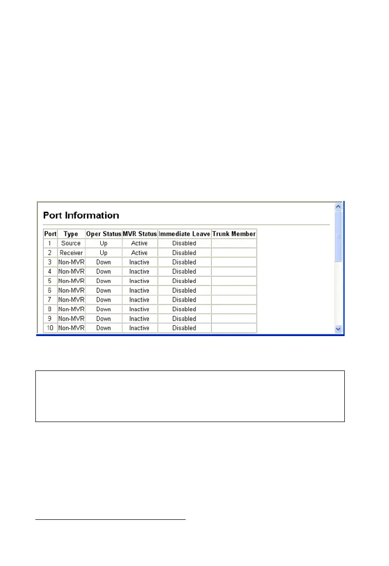 • MVR Status – Shows the MVR status. MVR status for source ports is “ACTIVE” if