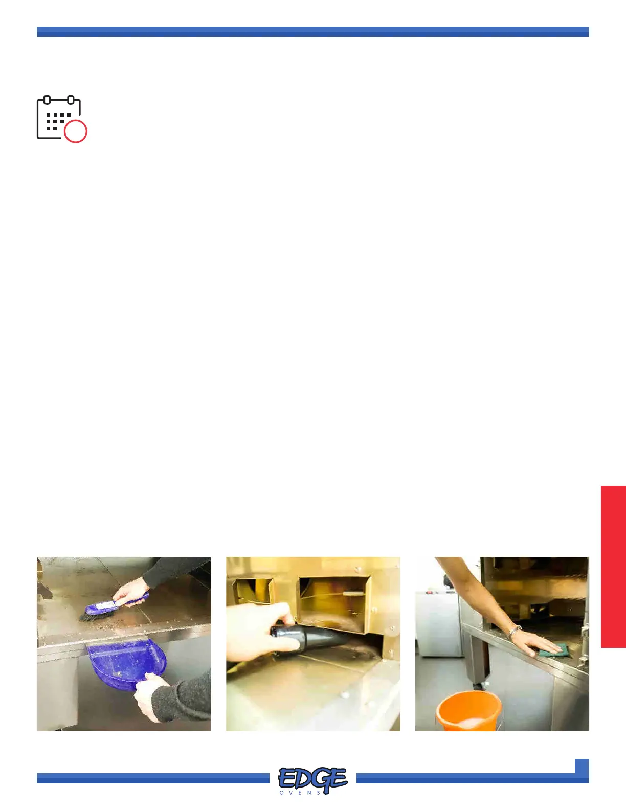 Debris removal from the oven cooking chamber should occur MONTHLY or as needed.