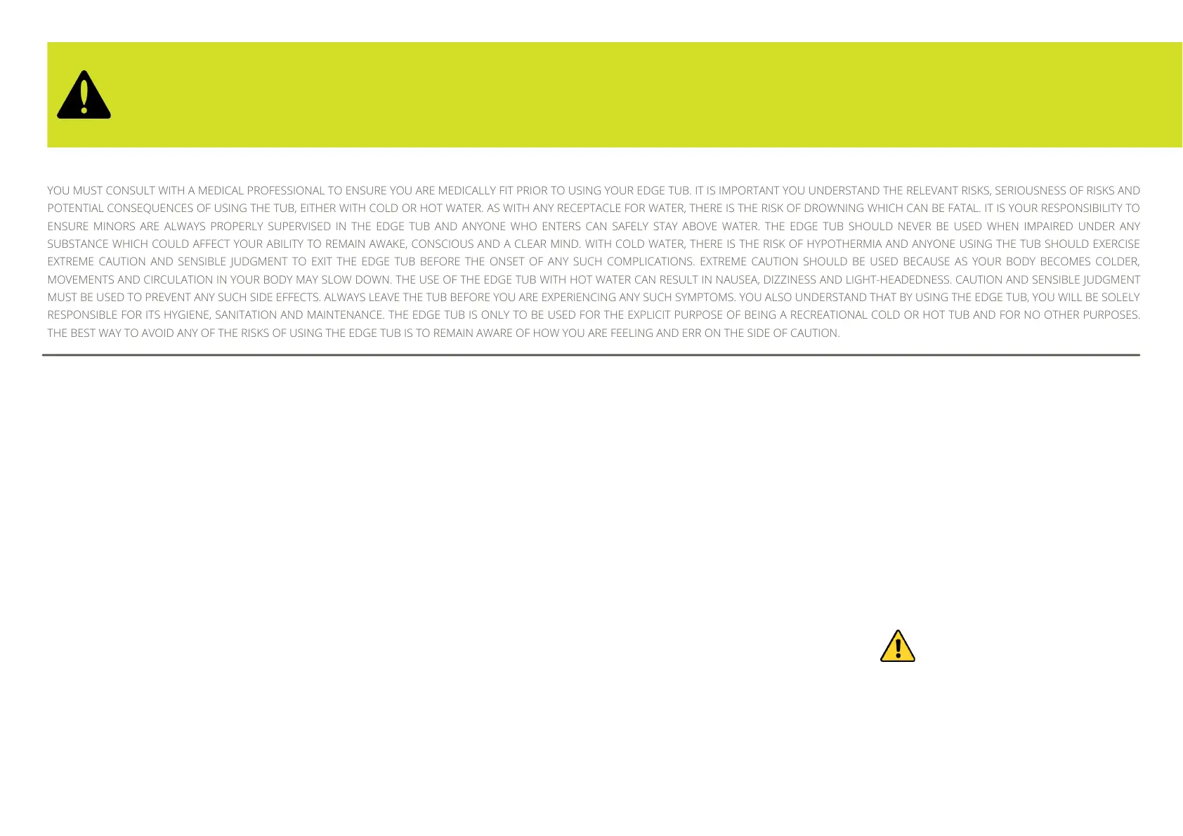 YOU MUST CONSULT WITH A MEDICAL PROFESSIONAL TO ENSURE YOU ARE MEDICALLY FIT PRIOR TO USING YOUR EDGE TUB. IT IS IMPORTANT YOU UNDERSTAND THE RELEVANT RISKS, SERIOUSNESS OF RISKS AND