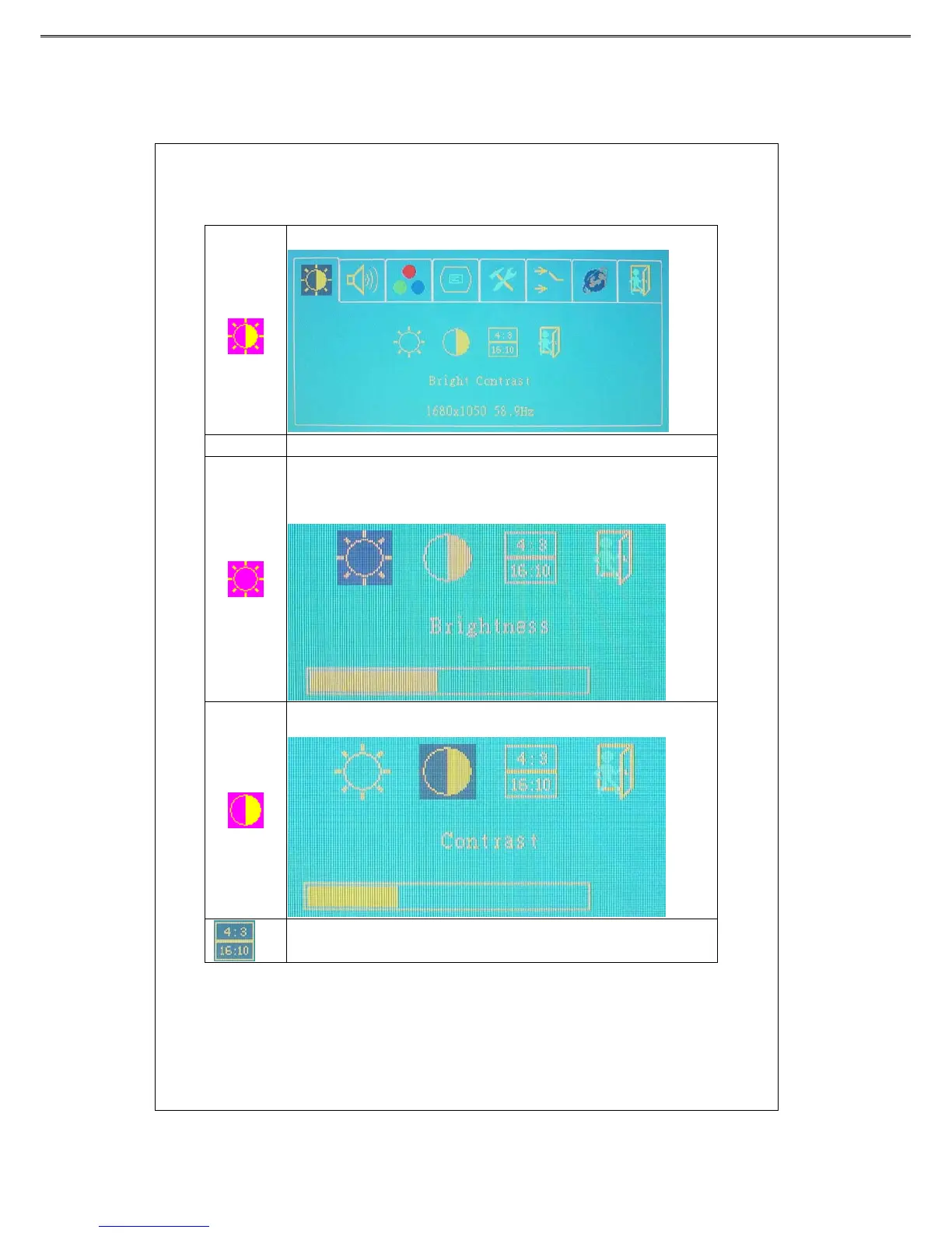 Press“+”or “-” key to adjust the numerical value of contrast (0-100). Press
