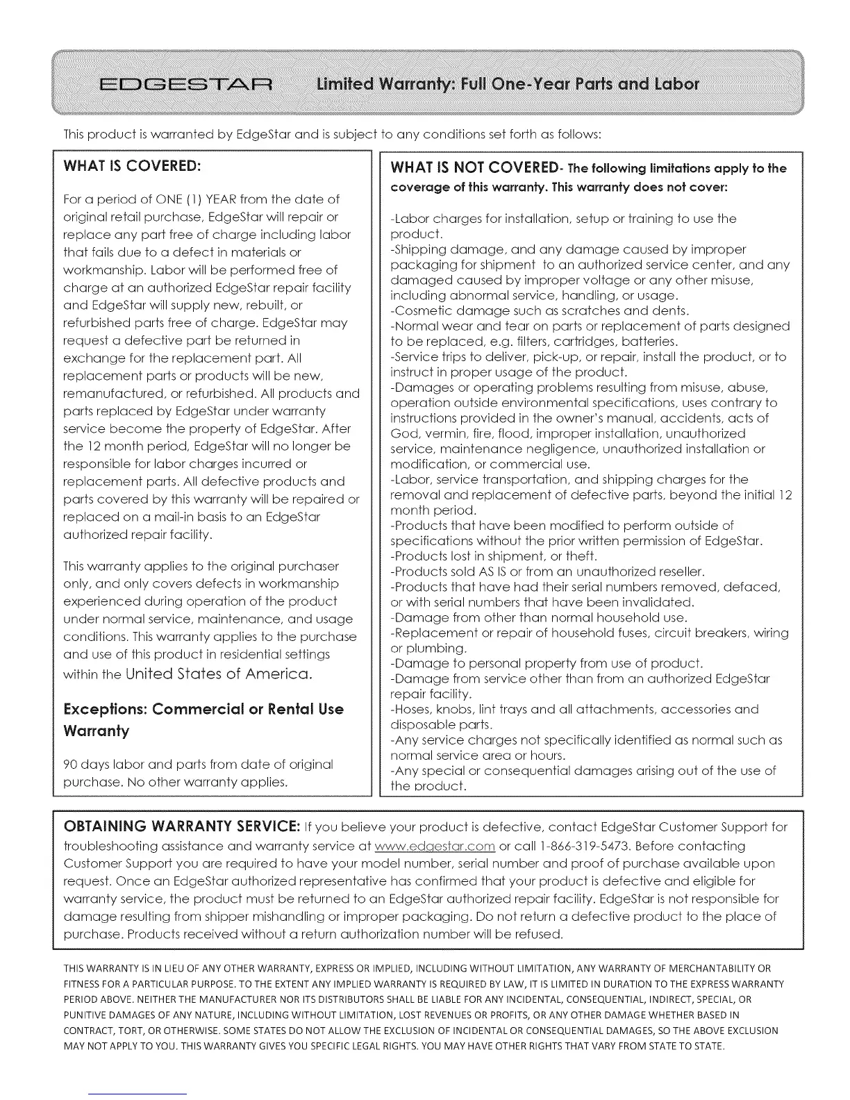 OBTAiNiNG WARRANTY SERVICE: If you believe your product is defective, contact EdgeStar Customer Support for