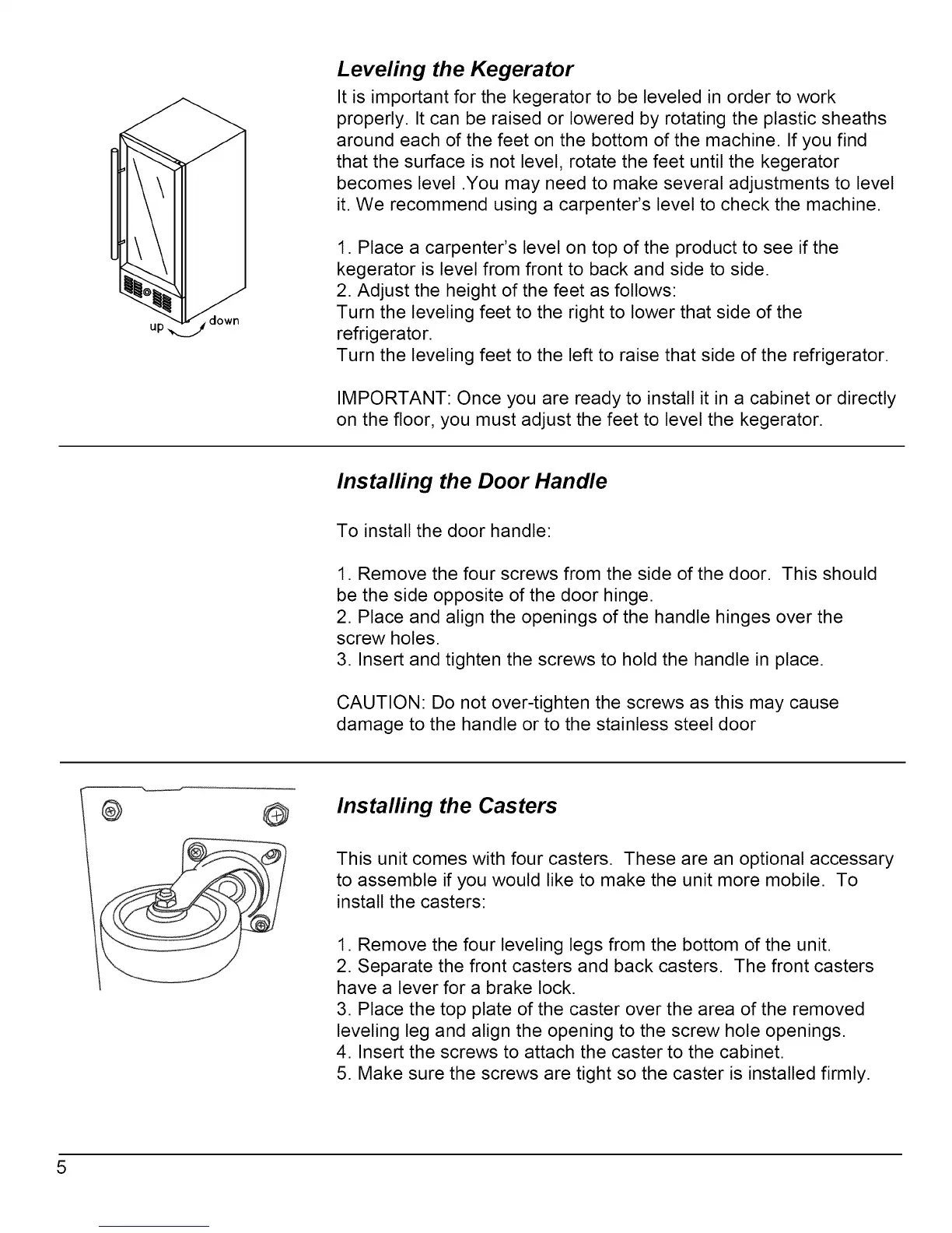 on the floor, you must adjust the feet to level the kegerator.