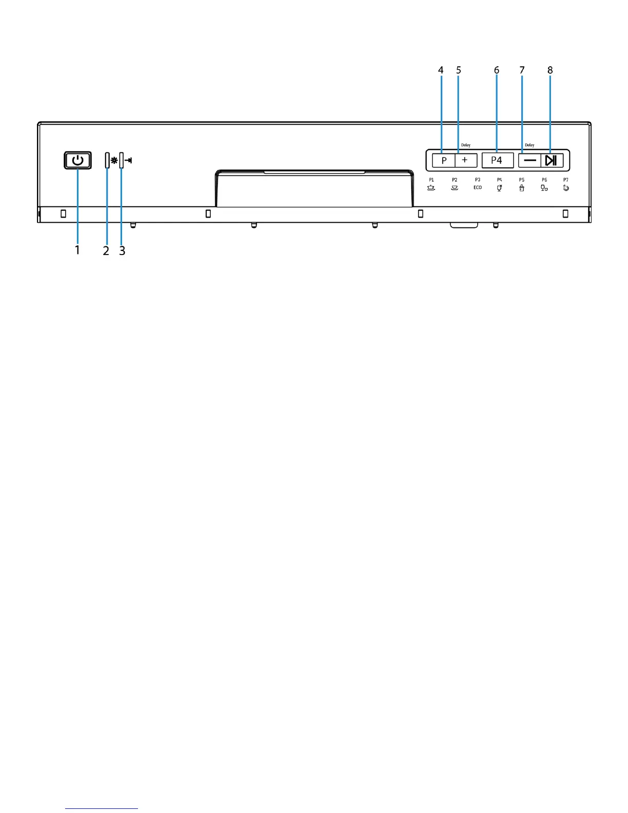 6. Display Screen: Shows the current dishwasher status (running or on delay) as well as the