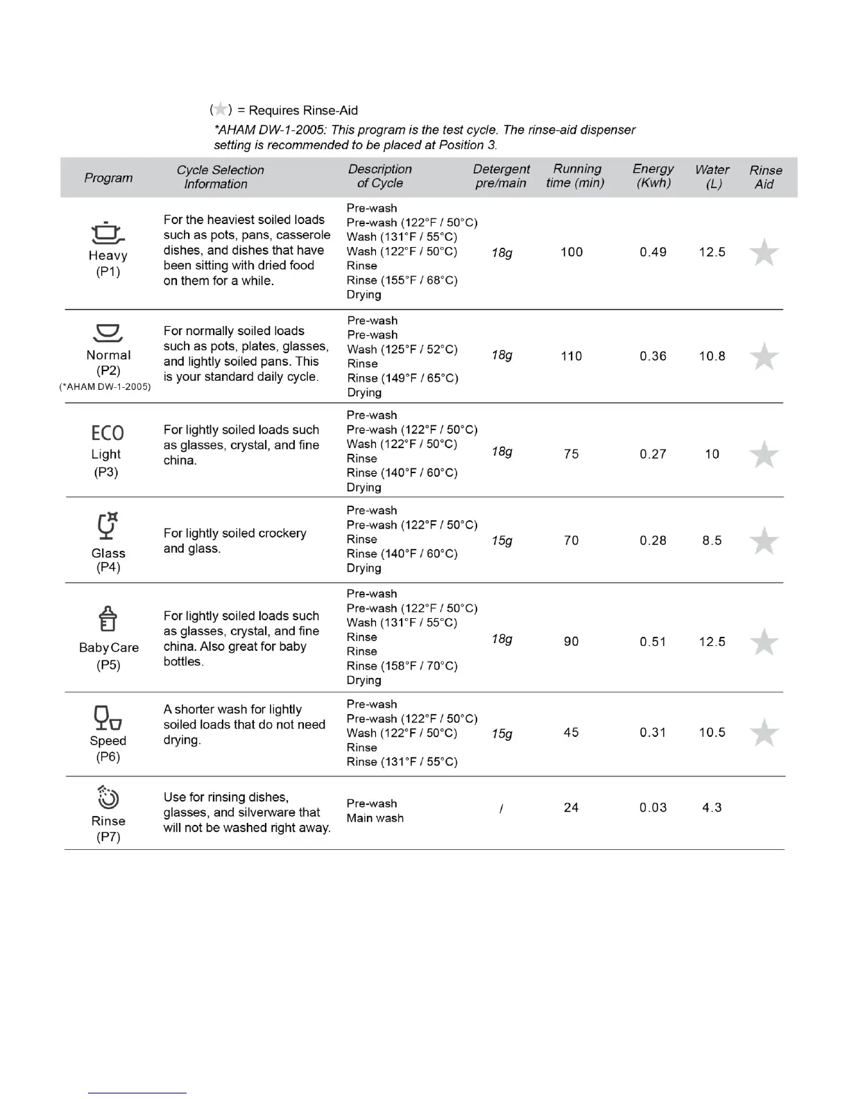 Wash Cycles Chart
