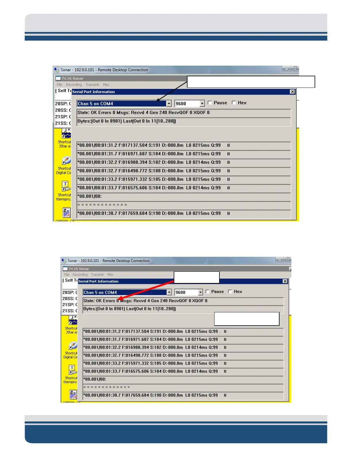 4. There should be no errors present in Sonar Toolbar and in the Serial Port Information window: