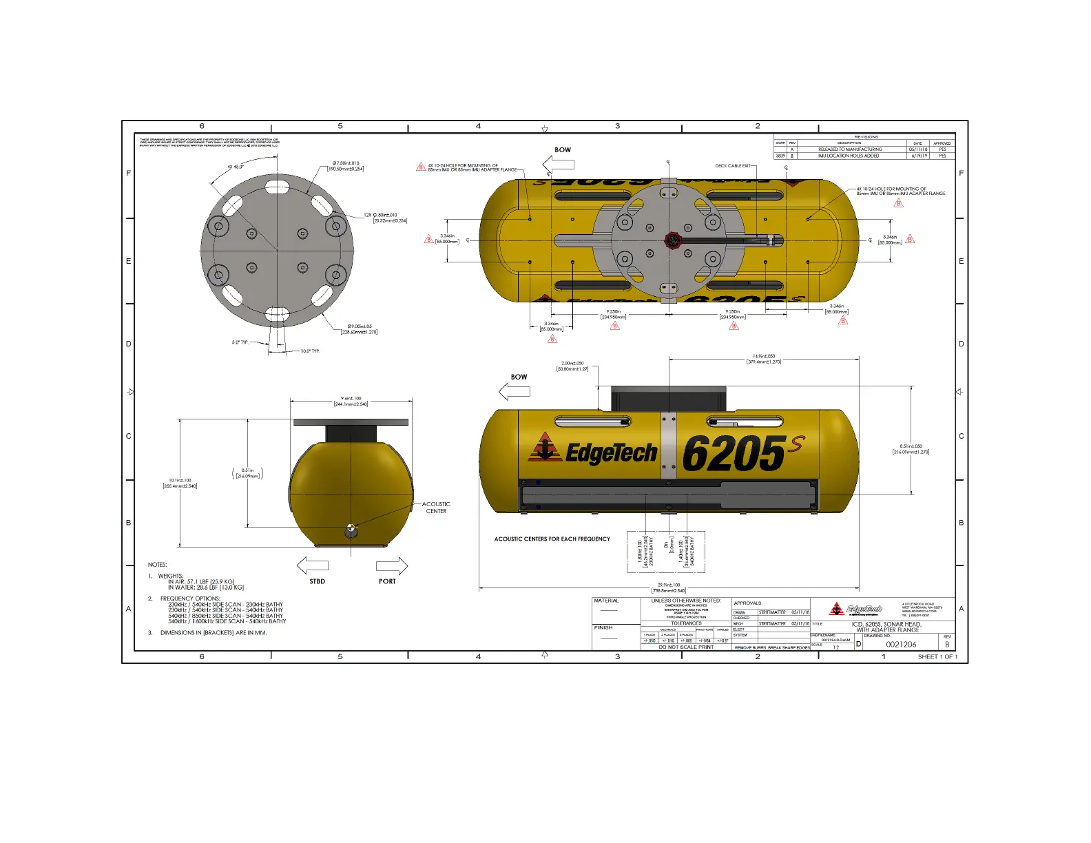 Edgetech 6205S - Figure 2-6: Acoustic Center Location in X, Y, and Z Dimensions and Bolt Pattern with Adaptor Flange - 0021206
