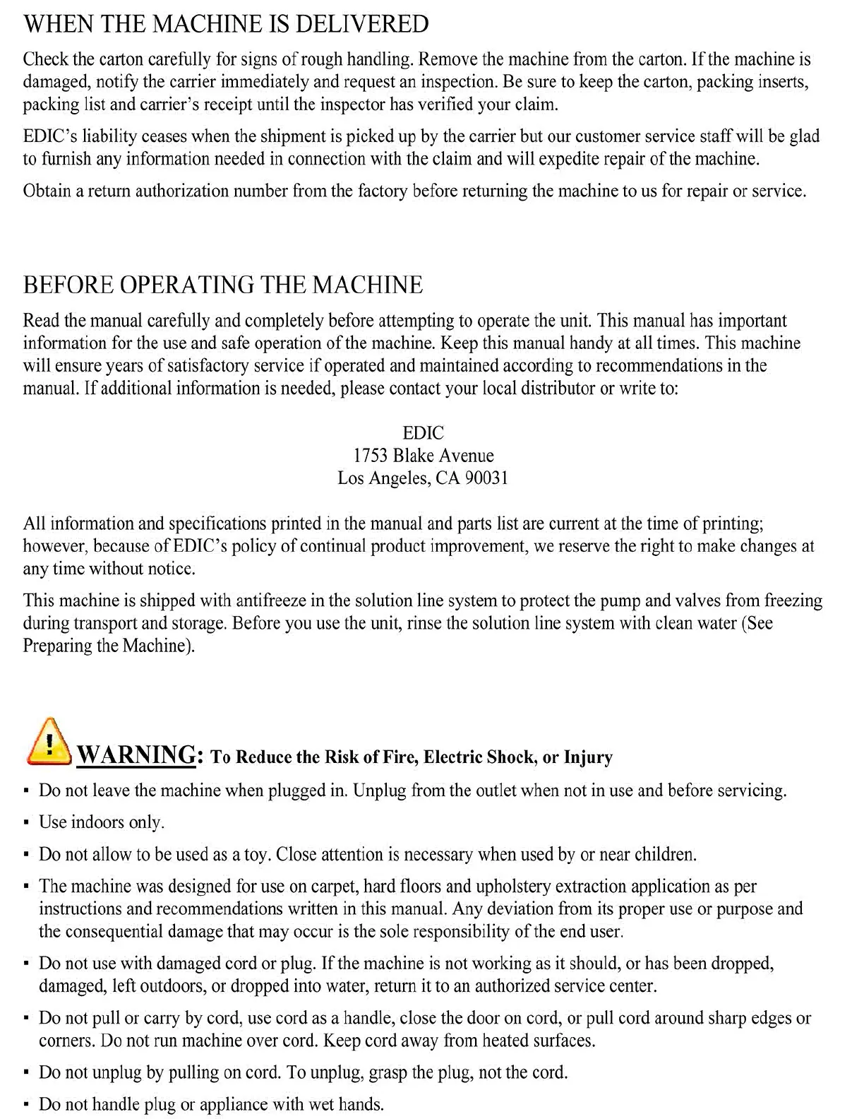 Edic Fivestar - Before Operating the Machine; Warning: Reduce Risk of Fire, Electric Shock, or Injury