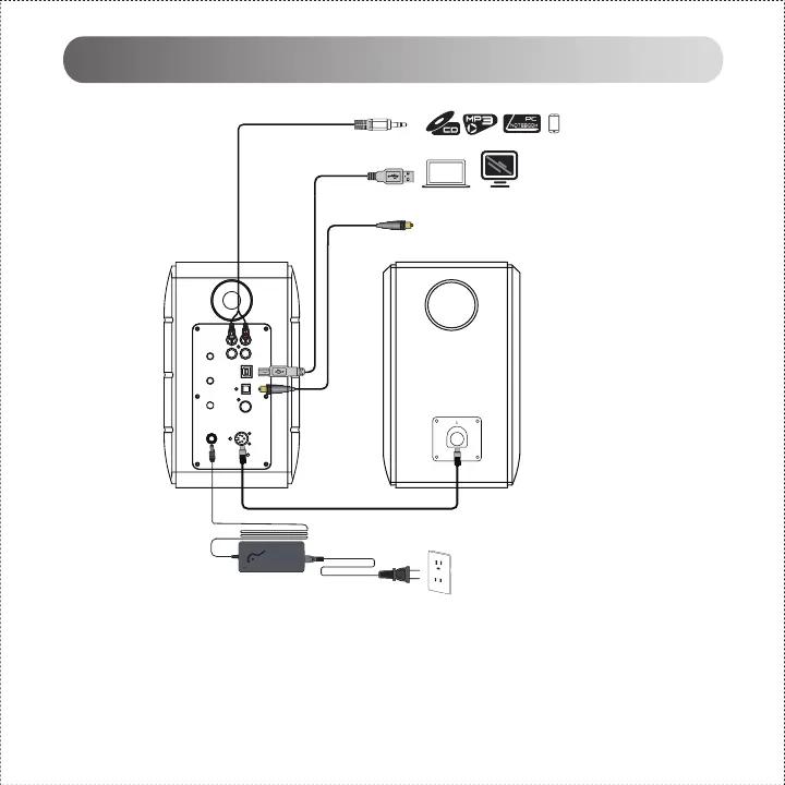 3. Den Lautsprecher über das Netzteil und das Netzkabel (im Lieferumfang enthalten) an die Stromquelle anschließen;
