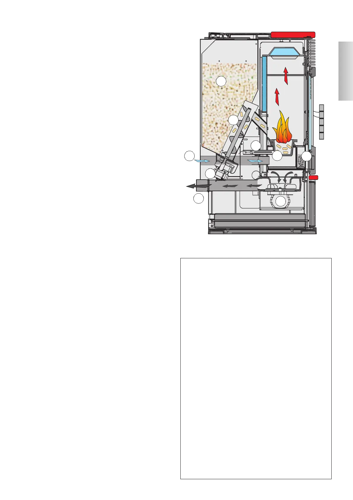 The fuel (pellets) is taken from the hopper (A) and delivered