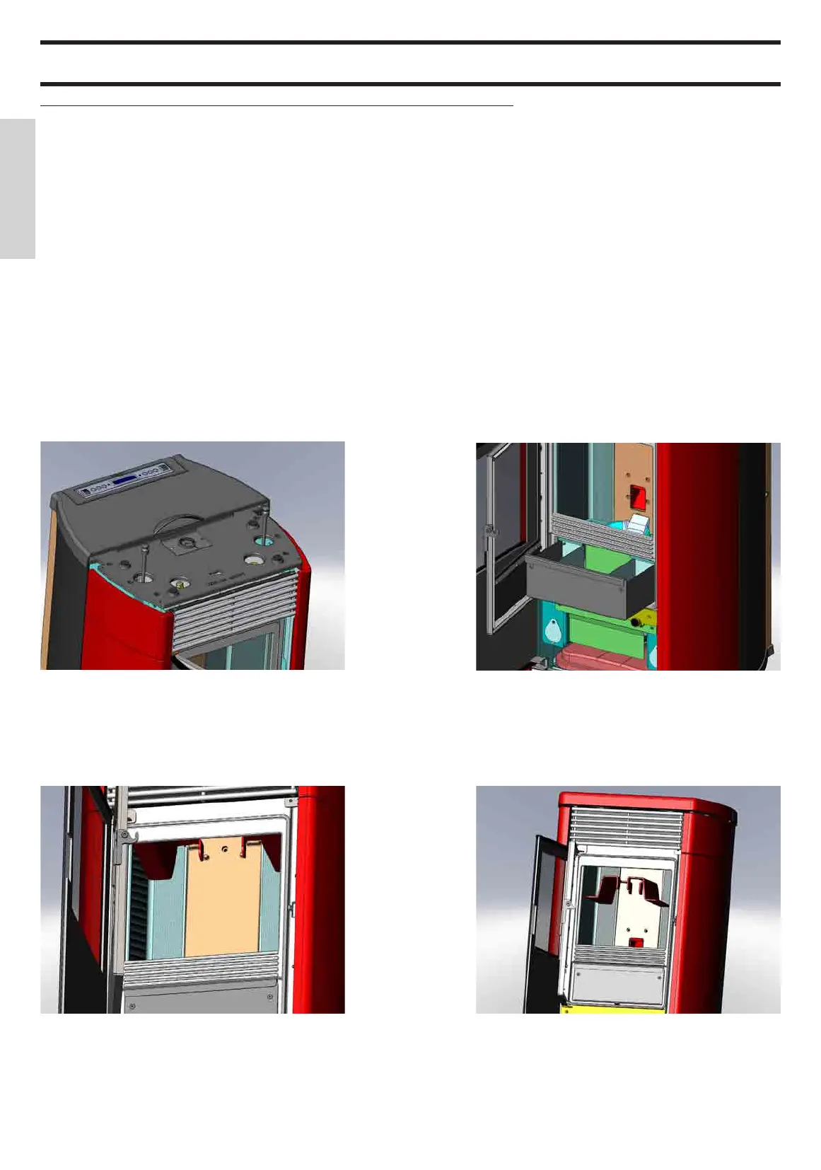 • Open the door and remove and empty the ash pan (**) (g. C).