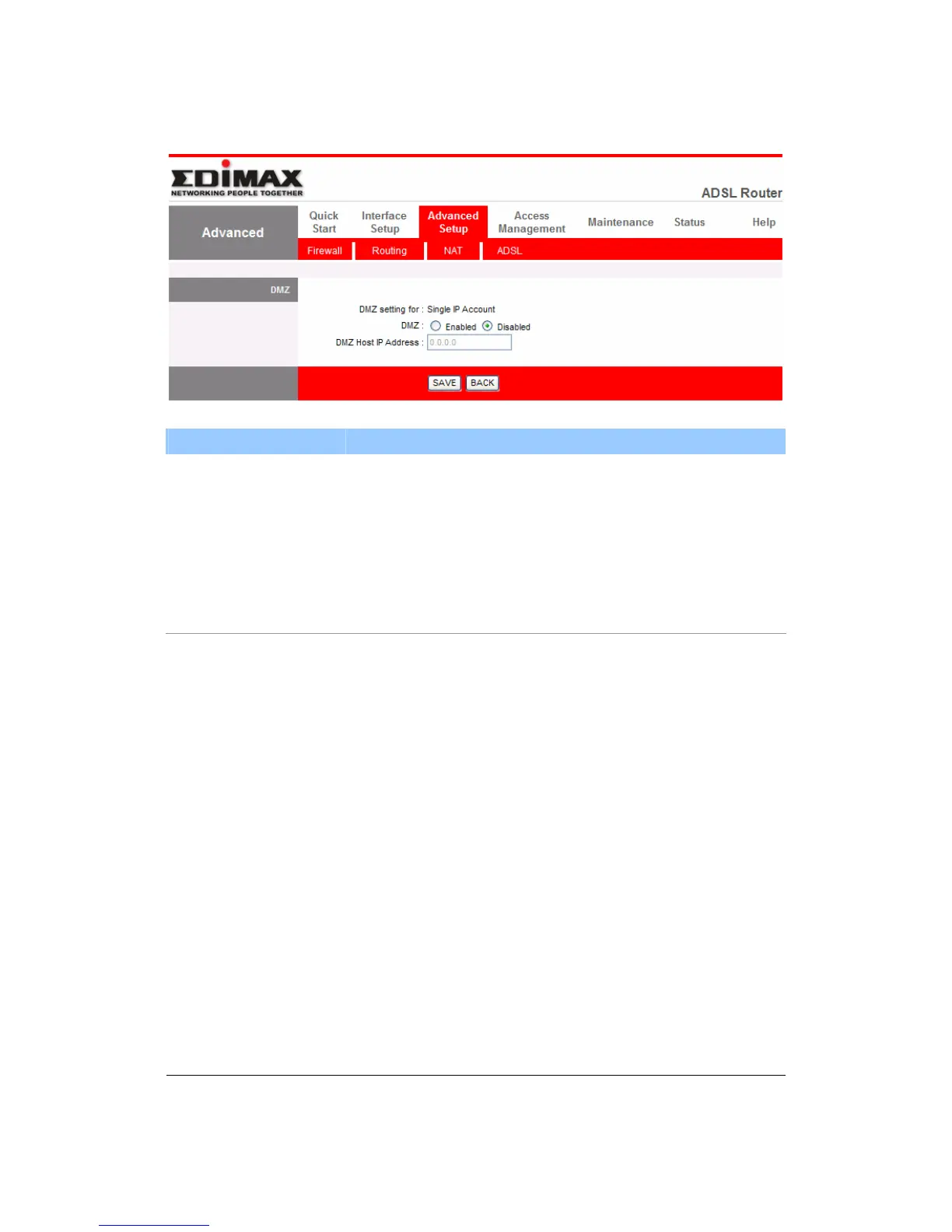 DMZ Host IP Address Enter a static IP Address to the DMZ Host. This IP
