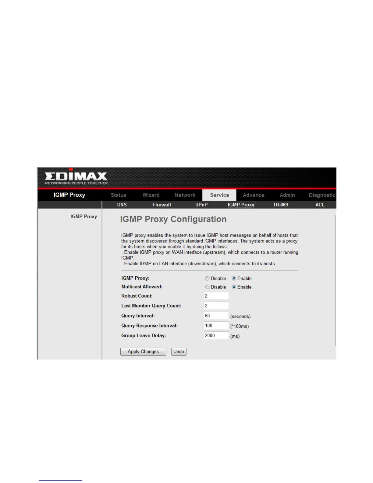 Click IGMP Proxy in the left bar to open the screen of Fig 3.6.6.1. IGMP proxy enables