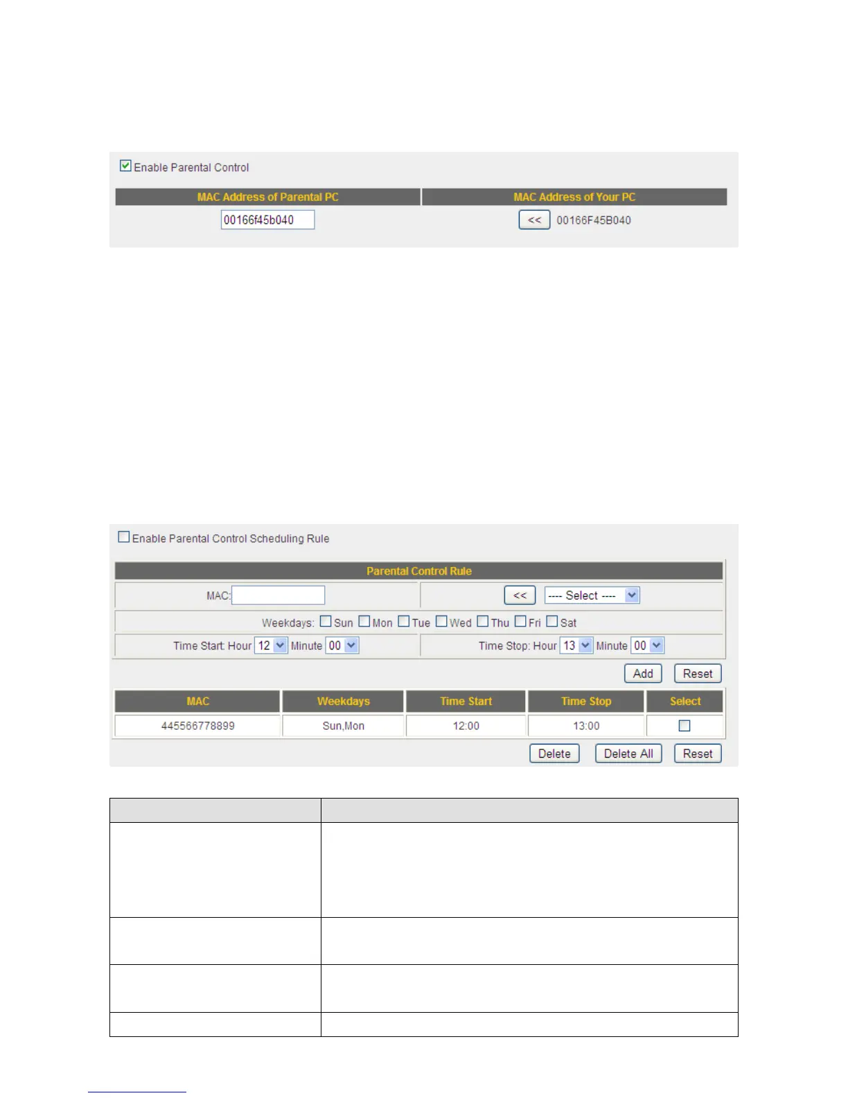 Toenabletheparentalcontrolfunction,check“EnableParentalControl”.Thisrouter