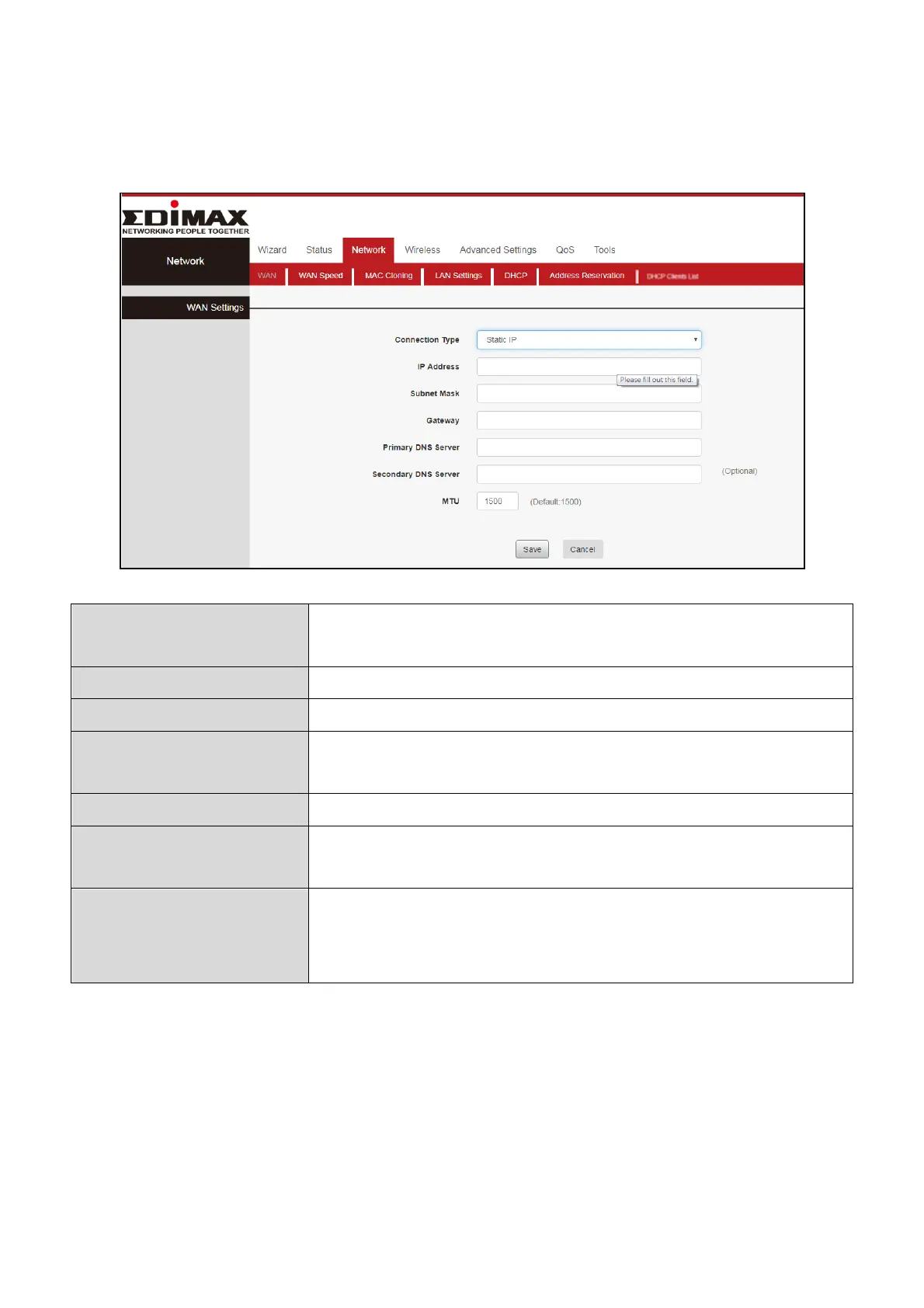Click “Network”, Select “WAN”, Select Connection Type “Static IP”. Then enter