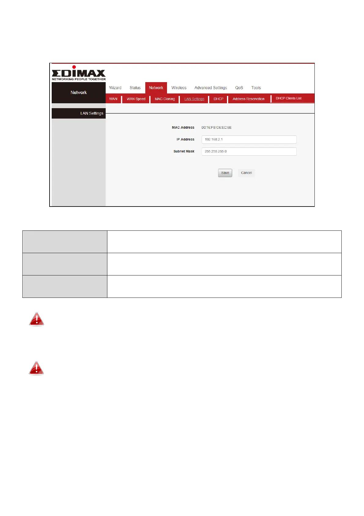 Click “Network”, select “LAN Settings”. Enter IP Address, Subnet Mask. Then